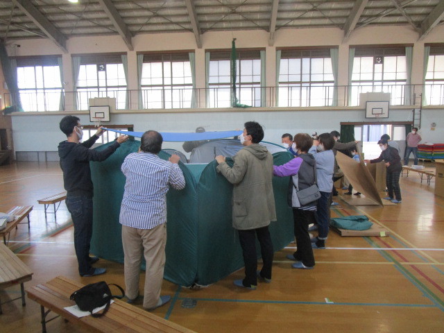 →体調不良者や高齢者等が使用するダンボールベッドと、体調不良者等を隔離するワンタッチパーテーションを組み立てて、その使用感を確認しました。