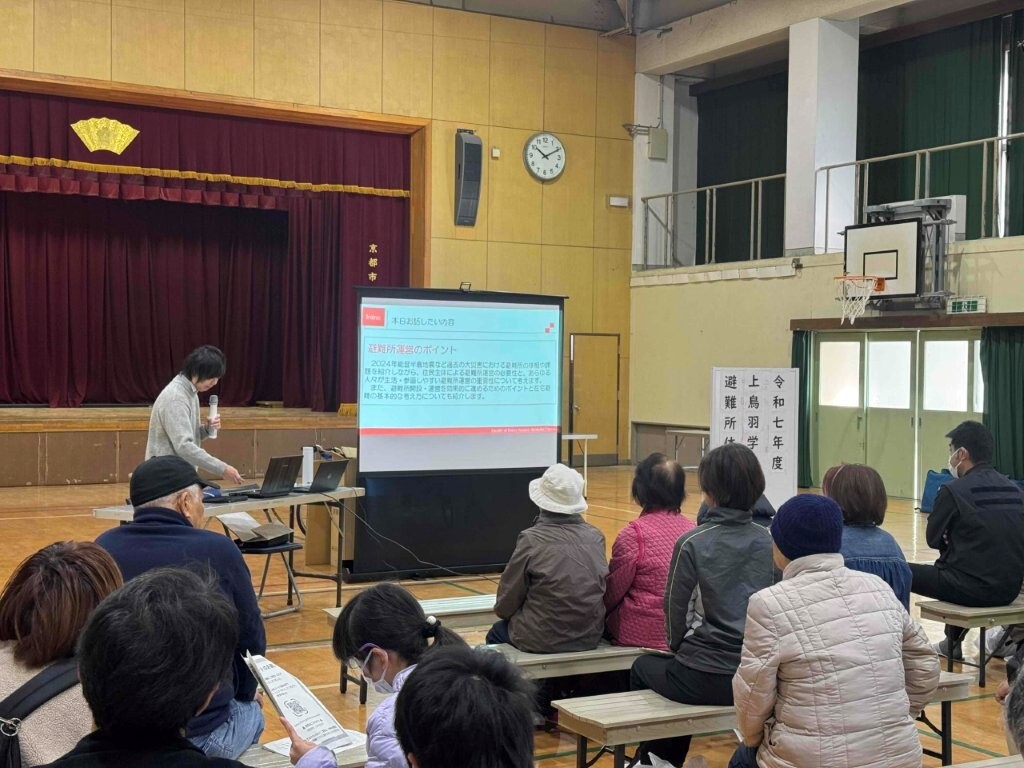 龍谷大学で防災研究をされている 石原凌河 准教授をお招きし、実際に避難所となる小学校体育館にて、発災初期段階には住民だけで避難所開設・運営をいただく必要があることなどを講話いただきました。その後、情報班や保健衛生班など避難所運営に必要な班別活動を体験して学ぶ研修会を開催しました。