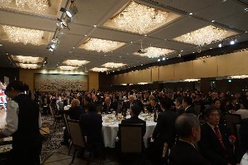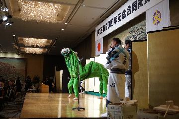 1月29日、リーガロイヤルホテル京都にて南区制70周年記念合同祝賀会が開催されました(主催:南区各種団体連絡協議会、南区体育振興会連合会、南消防団)。当日は約470名が参加し、南区制70周年と、「南区体育振興会連合会」並びに「南消防団」の創立70周年を盛大に祝いました。冒頭、同協議会の田中一明代表の挨拶、来賓祝辞、鏡開きと続き、乾杯後は、上鳥羽橋上鉦講中、久世六斎保存会の皆様による六斎念仏を観賞。続いて行われた、南消防団による挨拶・ラッパ隊による演奏、南区体育振興会連合会の皆様によるビンゴゲームもあり、華やかな会場は大いに盛り上がりました。