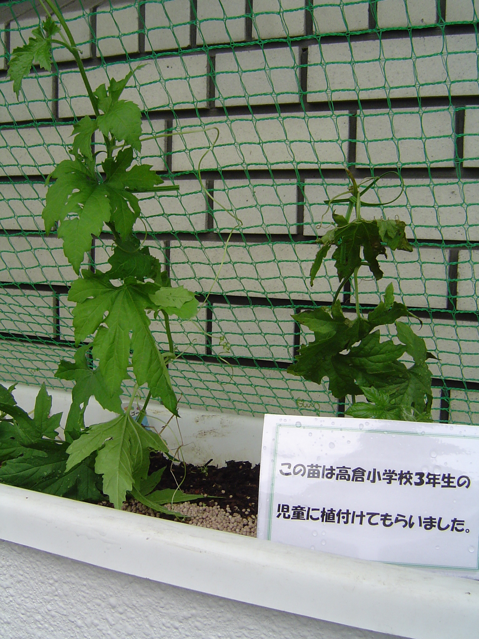 1ヶ月ほどでつるが2階まで伸び、夏に向けて緑化とともに、直射日光を遮るグリーンカーテンが出来上がる予定です。8月中頃まで設置しておりますので、中京区役所にお越しの際は、ぜひ御覧ください。