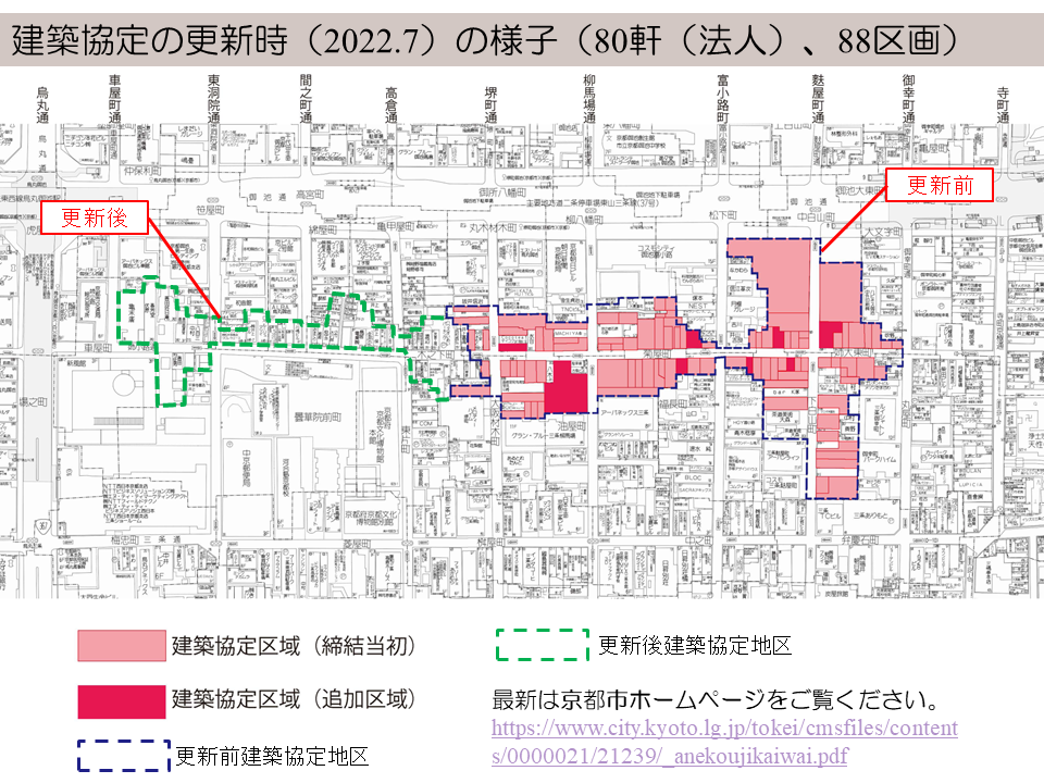 今年、協定の締結から20年が経ち、「更新」という新たな局面を迎えました。谷口さんは、これまでの活動と同じように、近隣の住宅を一軒ずつ訪問し、趣旨を丁寧に説明されるといった地道な取組を続けた結果、賛同者が新たに加わり、これまで御幸町通から堺町通までであった対象範囲を、さらに西側の車屋町通まで拡大させ、商業地域の中で、国内最大規模を誇る建築協定へと発展させました。「この界隈は『おもてなしのまち』です。協定締結から20年が経ち、これまで開発を巡る大きなトラブルもなく、姉小路界隈の町並みを守ることができたのは、地域内の各店舗等も含めた地域住民のまちへの愛着と誇りがあったからです。」と谷口さん。地区計画の更新も控え、さらなる活動に意欲を燃やしておられます。