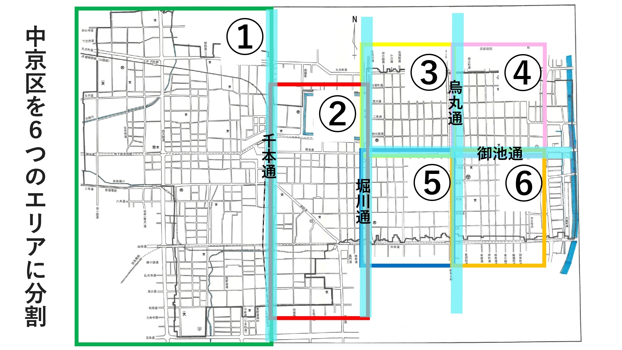 ワークショップでは、6つのエリアに分けた中京区の地図(※)を使い、全9グループで参加者それぞれの「通り」への思い、おすすめのスポットなどを語り合い、参加者の皆様の思いが詰まったオリジナルマップを作成していただきました。