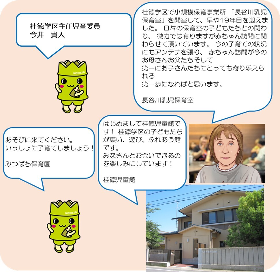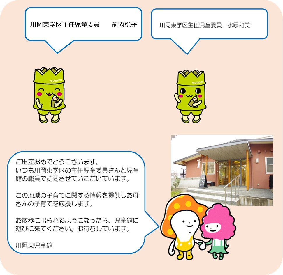お住まいの学区の主任児童委員や児童館、保育園の先生などが、お家に行かせていただきます。