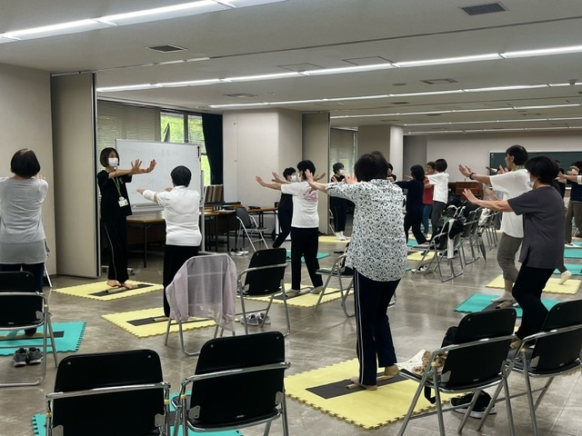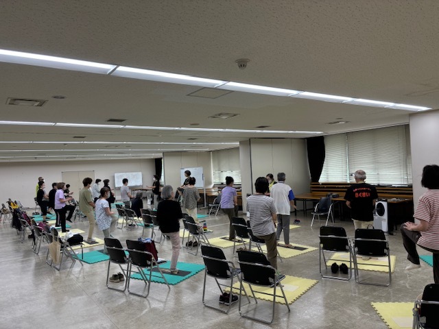 本教室では、地域の健康づくりを応援しているボランティア「健康づくりサポーターらくさい」(通称:らくサポ)の皆さんと一緒に、音楽に合わせて竹を踏む竹エクササイズを行います。