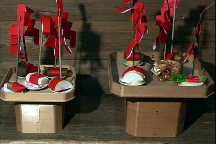 編んだ藁で赤飯を包む「ゆり膳」,柿・栗・鶏頭(けいとう)・菊などで美しく盛られる「花膳(はなぜん)」,季節の野菜を飾る一の膳,二の膳,合計31ものお供えが並びます。