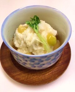 冬といえば温かい蒸し物が嬉しい季節です。かぶら蒸しは通常,中の具を白身魚で作りますが,ちょっとボリュームを出すため豚と鶏のミンチ肉を使い,粘りを出すため里芋を入れました。上にかけたあんが食欲をそそり,ギンナンが白に映えてキレイです。