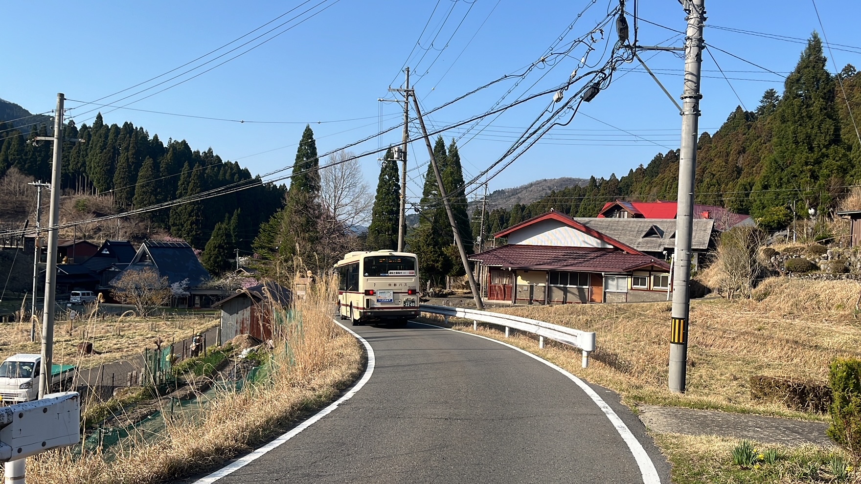 一日二便の、貴重な地域の交通機関です。このバスは日本にここにしかないメロディーバスなのだそうで、音楽を流しながら走っています。バス停はありますが、どこでも乗り降りできるのだそうです。