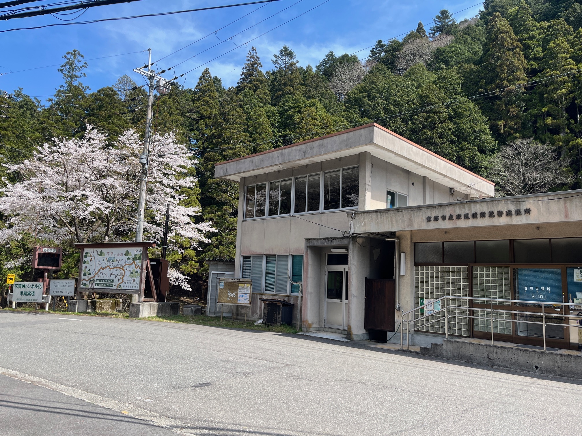 花背出張所前を出発。この日は4月某日、春がゆっくりな花脊ではまだ桜が咲いています。