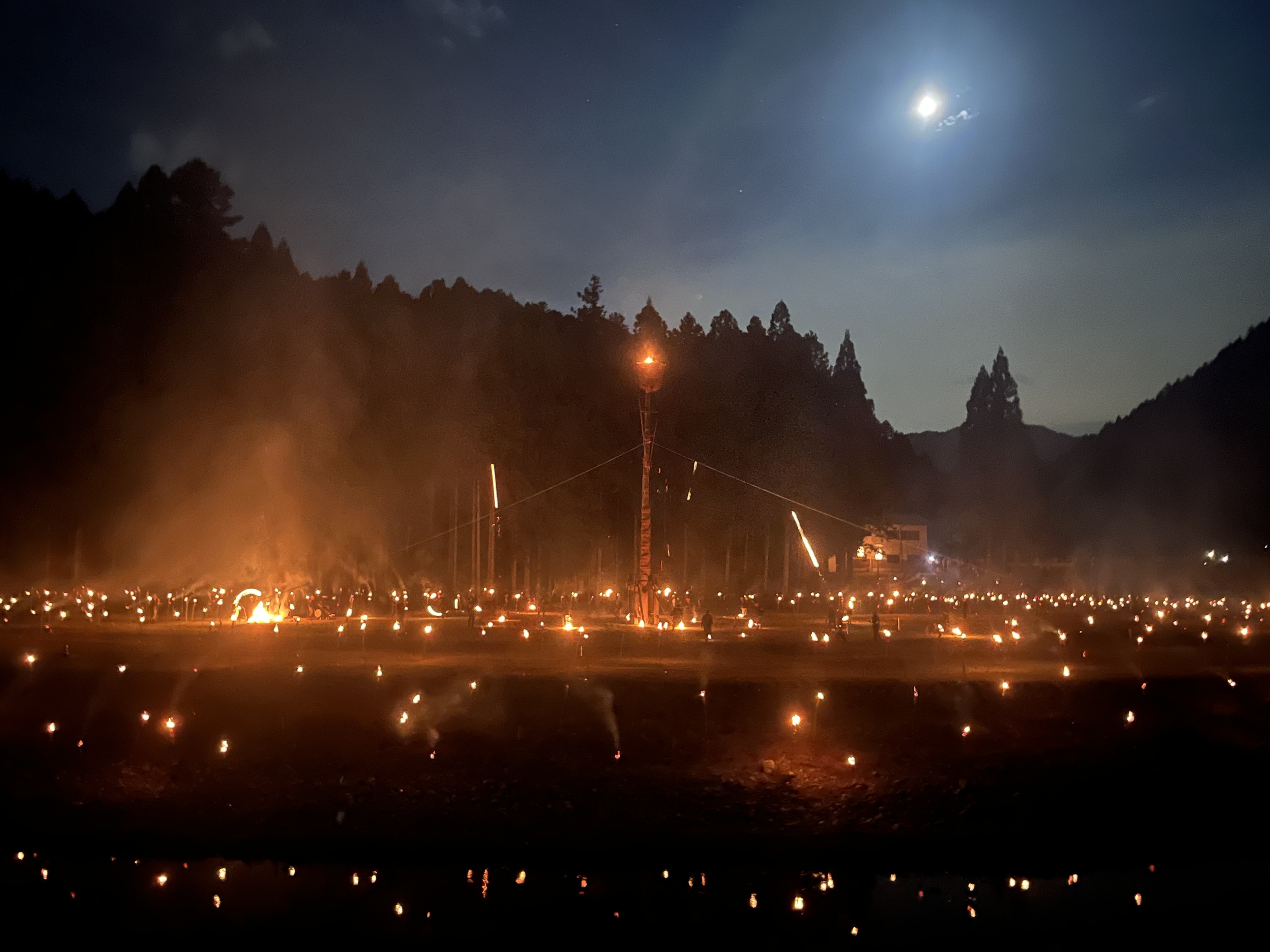 今年の花背松上げ。中央のトロギに向かって松明が放り上げられます。私の写真は(あえて)何も語っていないので、ぜひみなさまご自身の目でご覧いただきたいと思います。