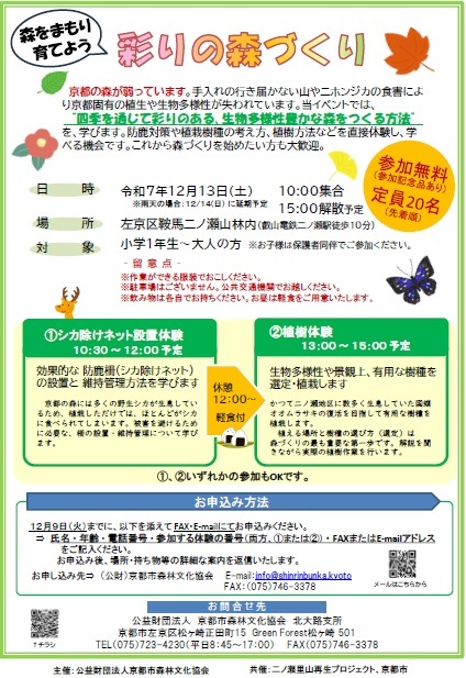 生物多様性豊かな京都の森を育てるための方法を直接体験し、学べるイベントを開催!
