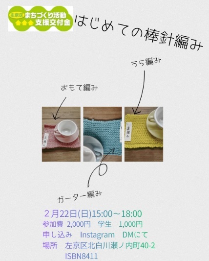 基本の編み方3種類を一緒にやってみましょう! 糸も棒針も用意しますので、どんな風に道具を揃えるのかわからない人も安心してきてください。【日時】