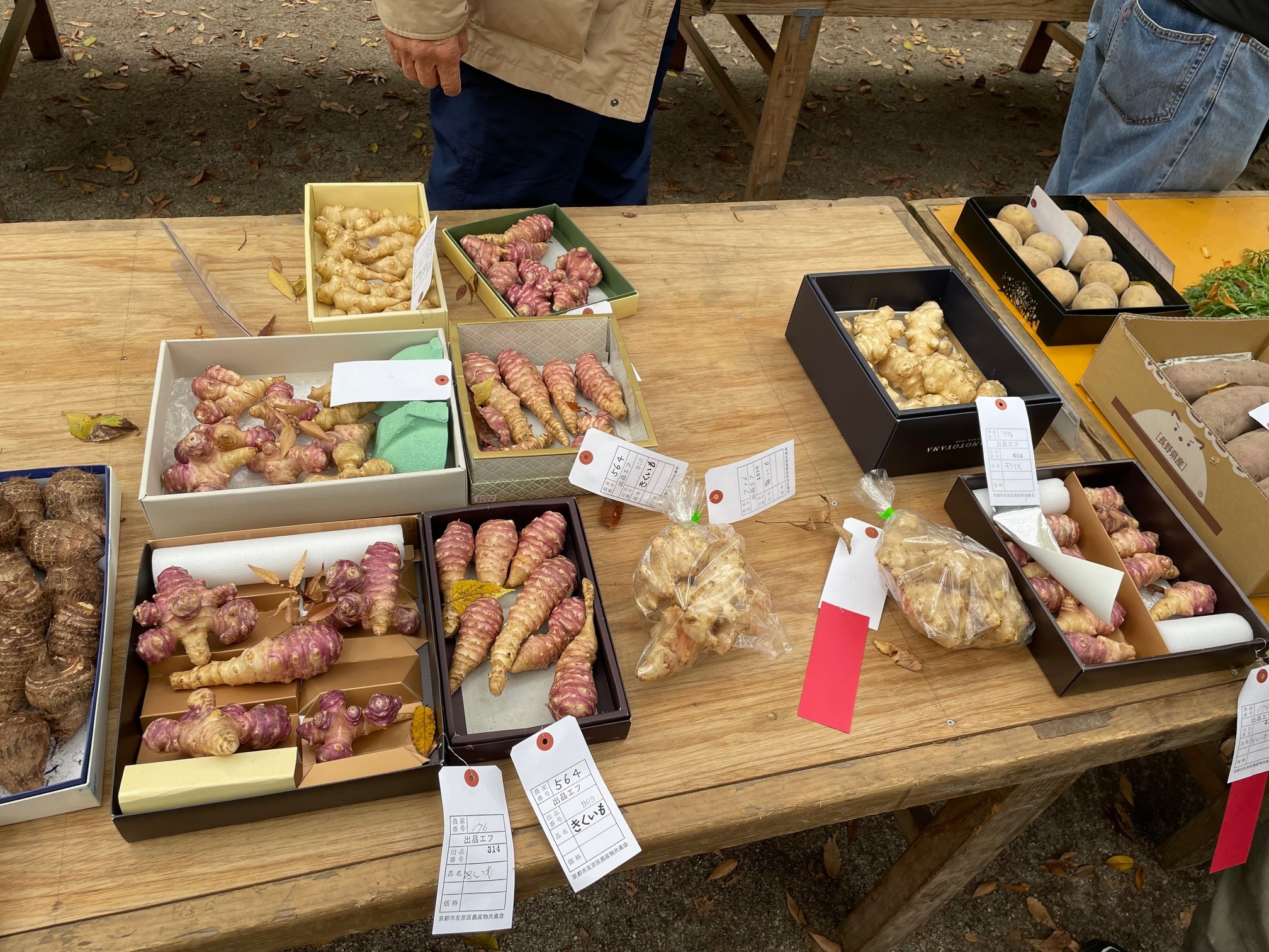 大根、かぶ、にんじん、白菜、ねぎ、さといもなど、おなじみの野菜をはじめ、柿、柚などの果物、菊芋チップス、干柿などの加工品もあり、すべて左京区内で育てられた逸品ばかりです。