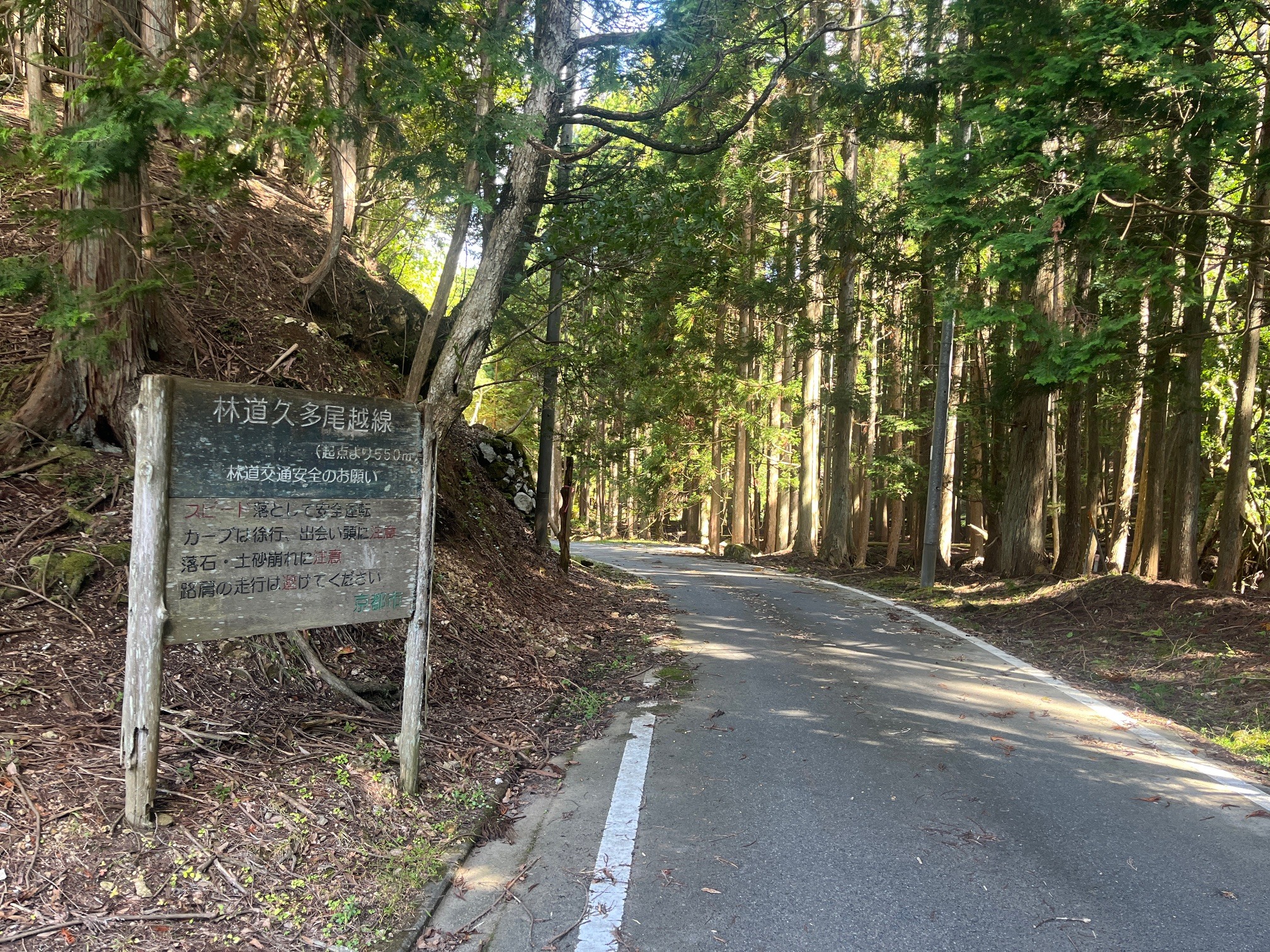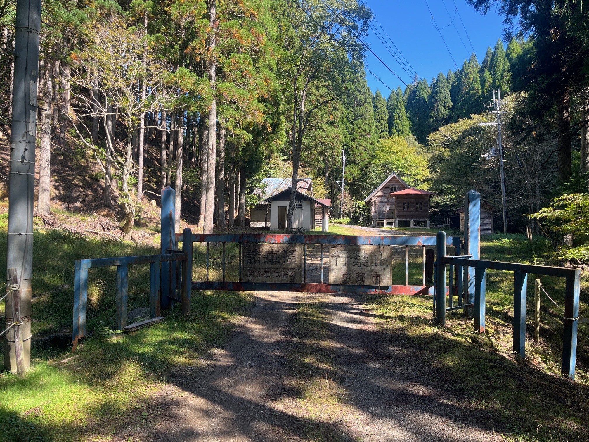 このあたりの森林は久多市有林に属しています。久多市有林には、京都府内で2番目に高い峰床山や、近畿地方では珍しい高層湿原の八丁平もあります。ゲートが閉じていました。車で入れるのはここまで。「諸車通行禁止 京都市」とあります。