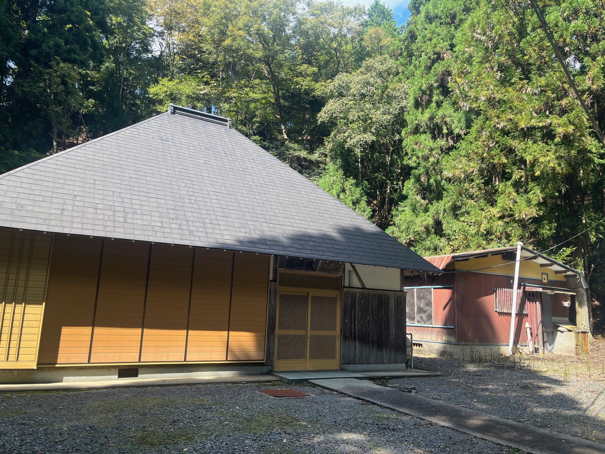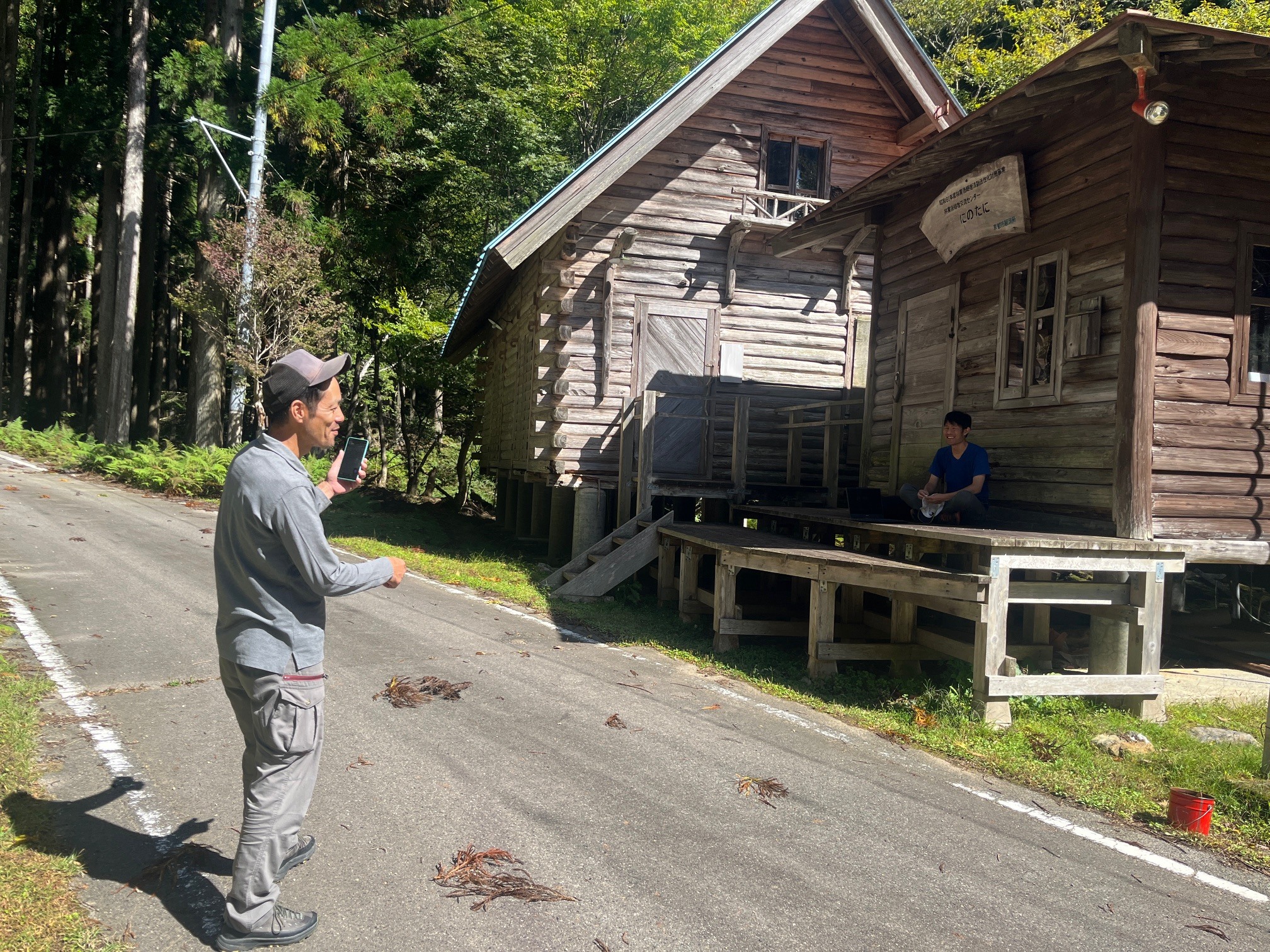 奥は「久多市有林管理舎 にのたに」の建物で、京都市経済局による看板がありました。かなり古いものです。にのたにの施設では、京都市森林文化協会の職員さんが、通信のテストをされていました。