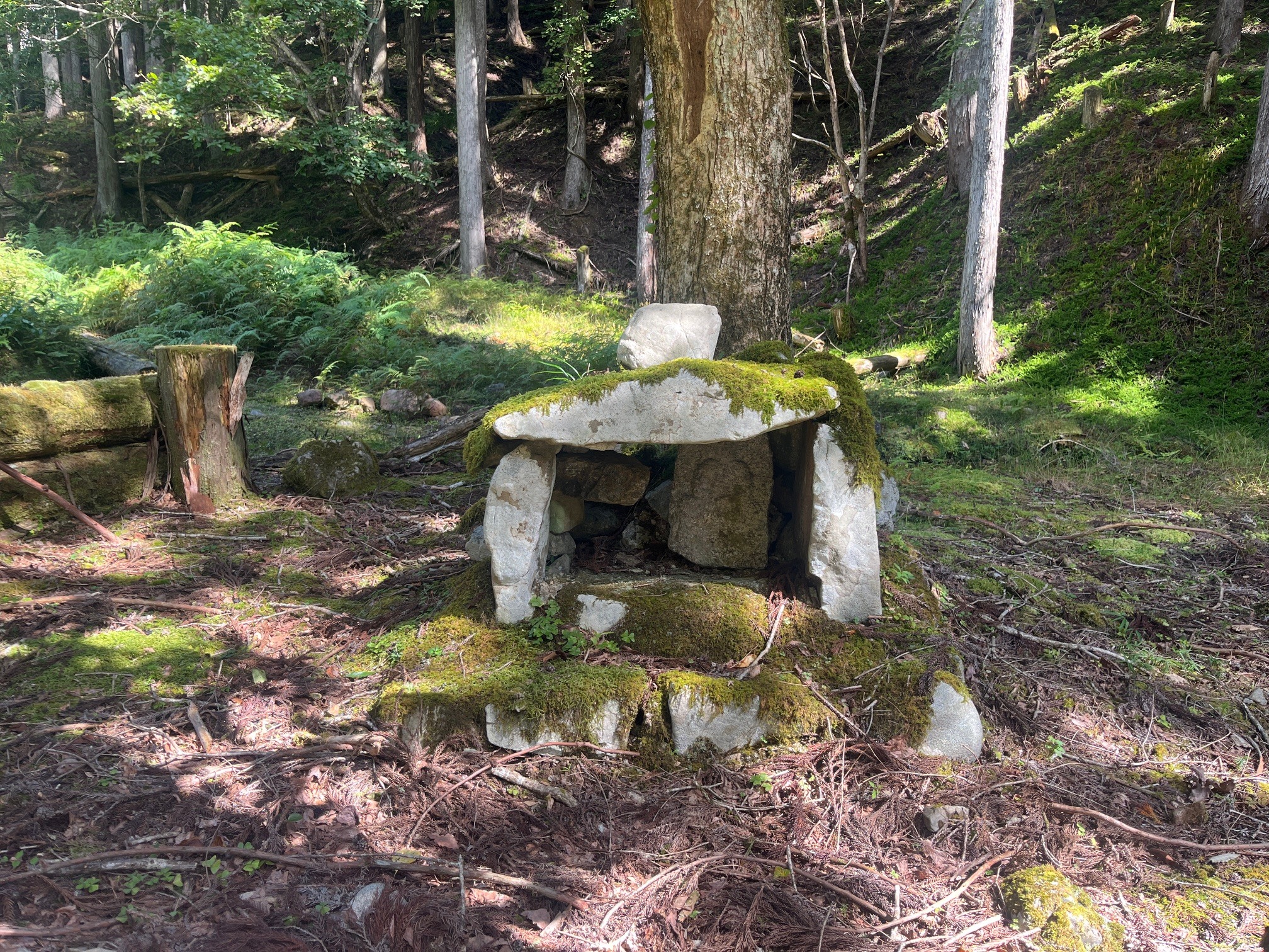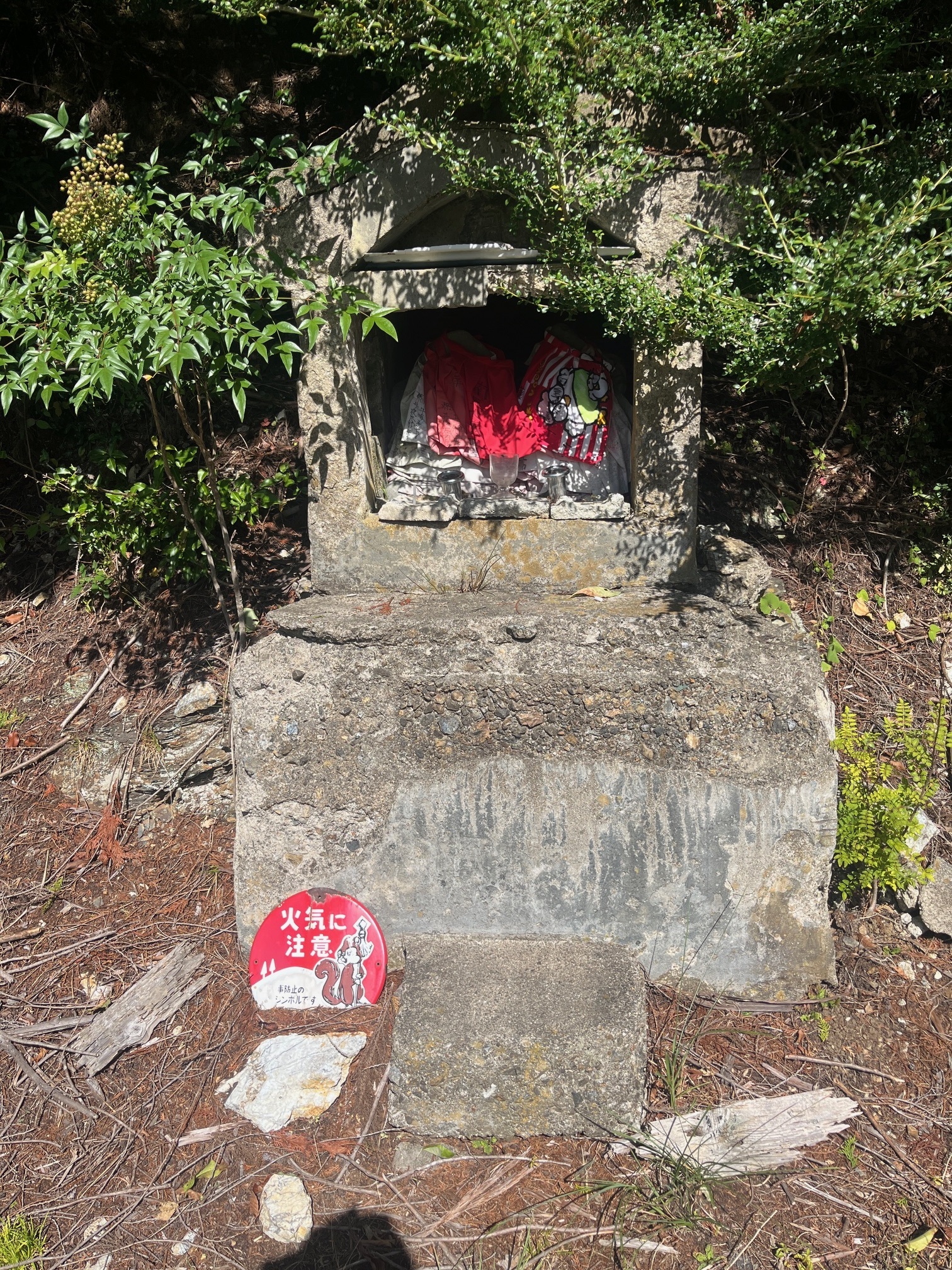 正面のお地蔵様。花を手向ける人が絶えて久しいのでしょう。お顔もなくなっており、住民がいなくなった頃から時が止まったままのように見えます。赤い前掛けには、こどもの名前などが書き込まれていました。