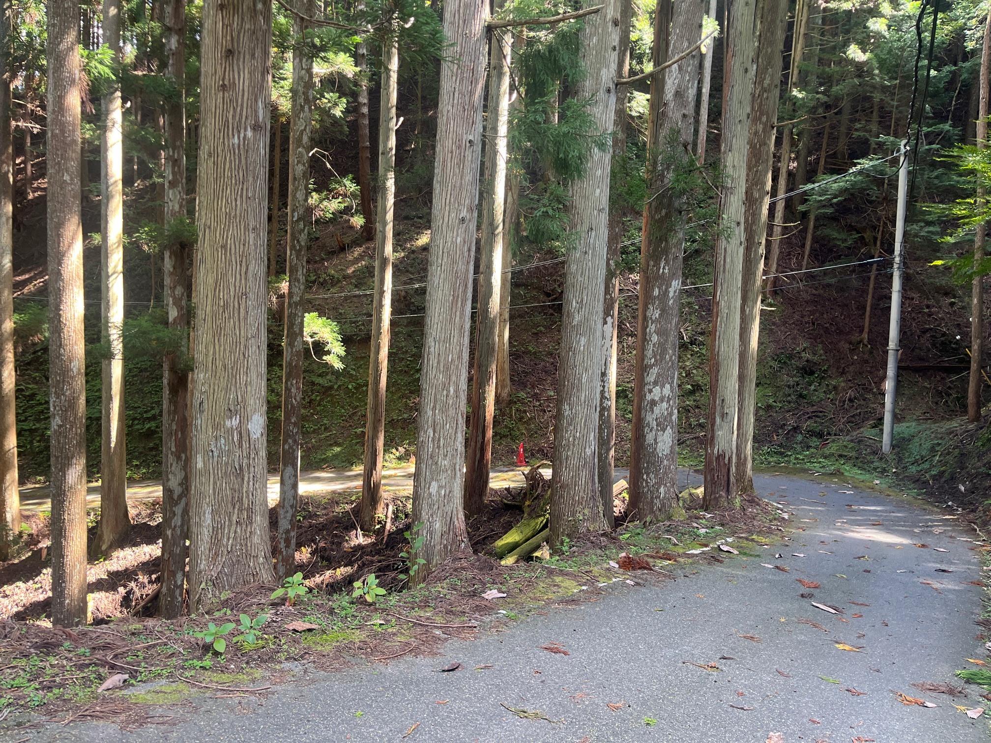 百井の地鶏料理の名店「とり幸」さんもこのあたり。これから杉木立の中を抜ける道に入っていきます。大見まで約6km。