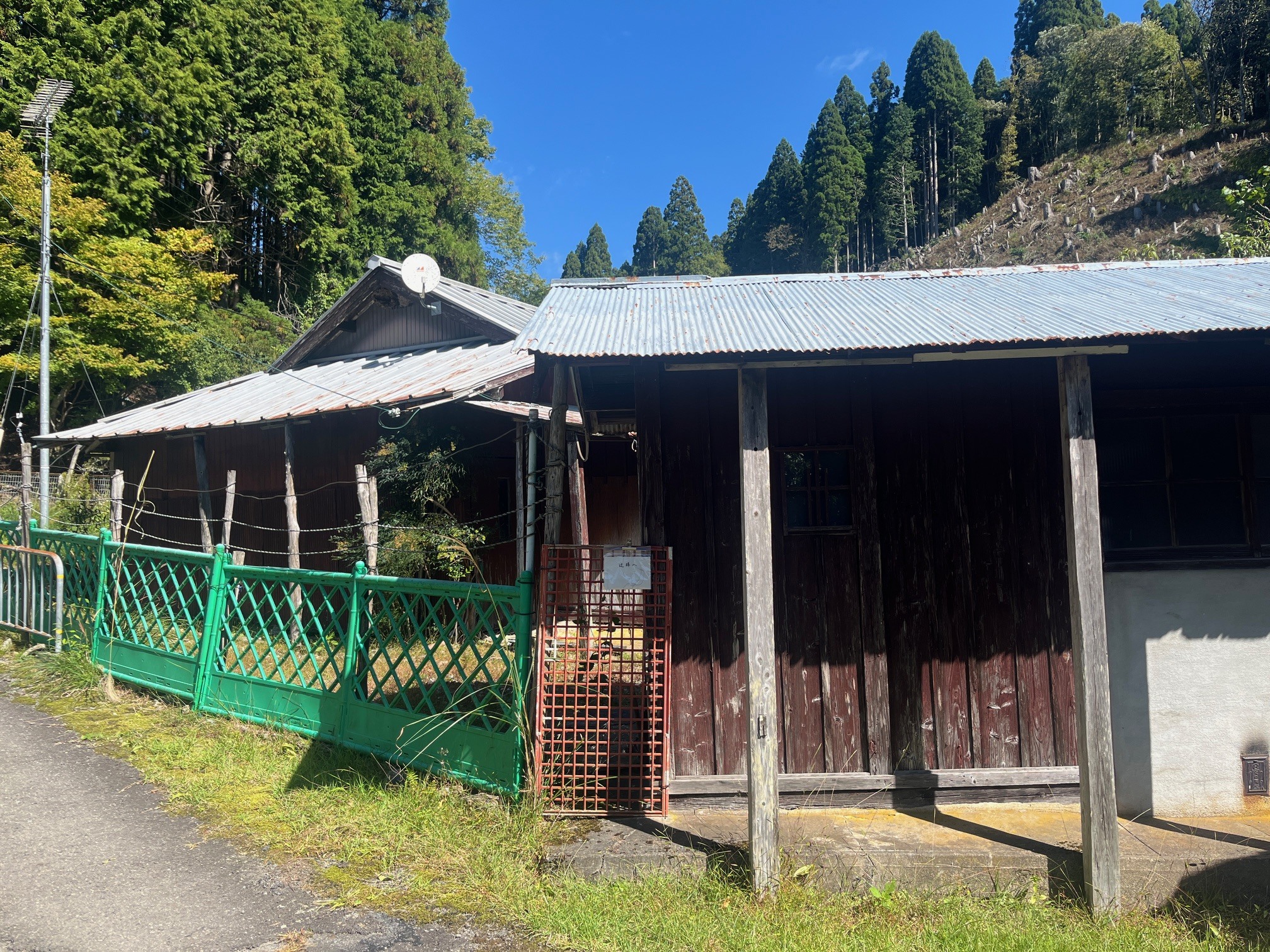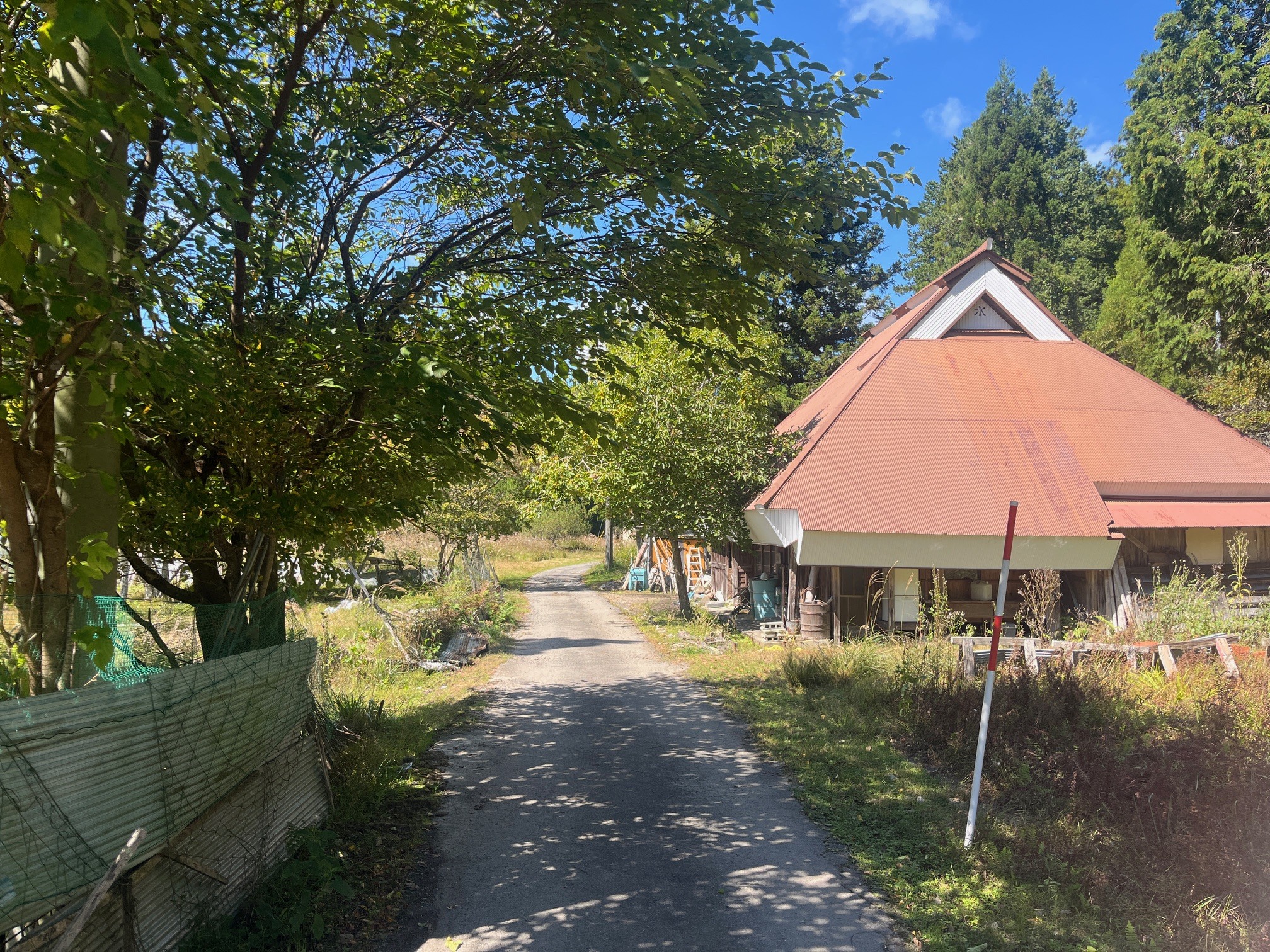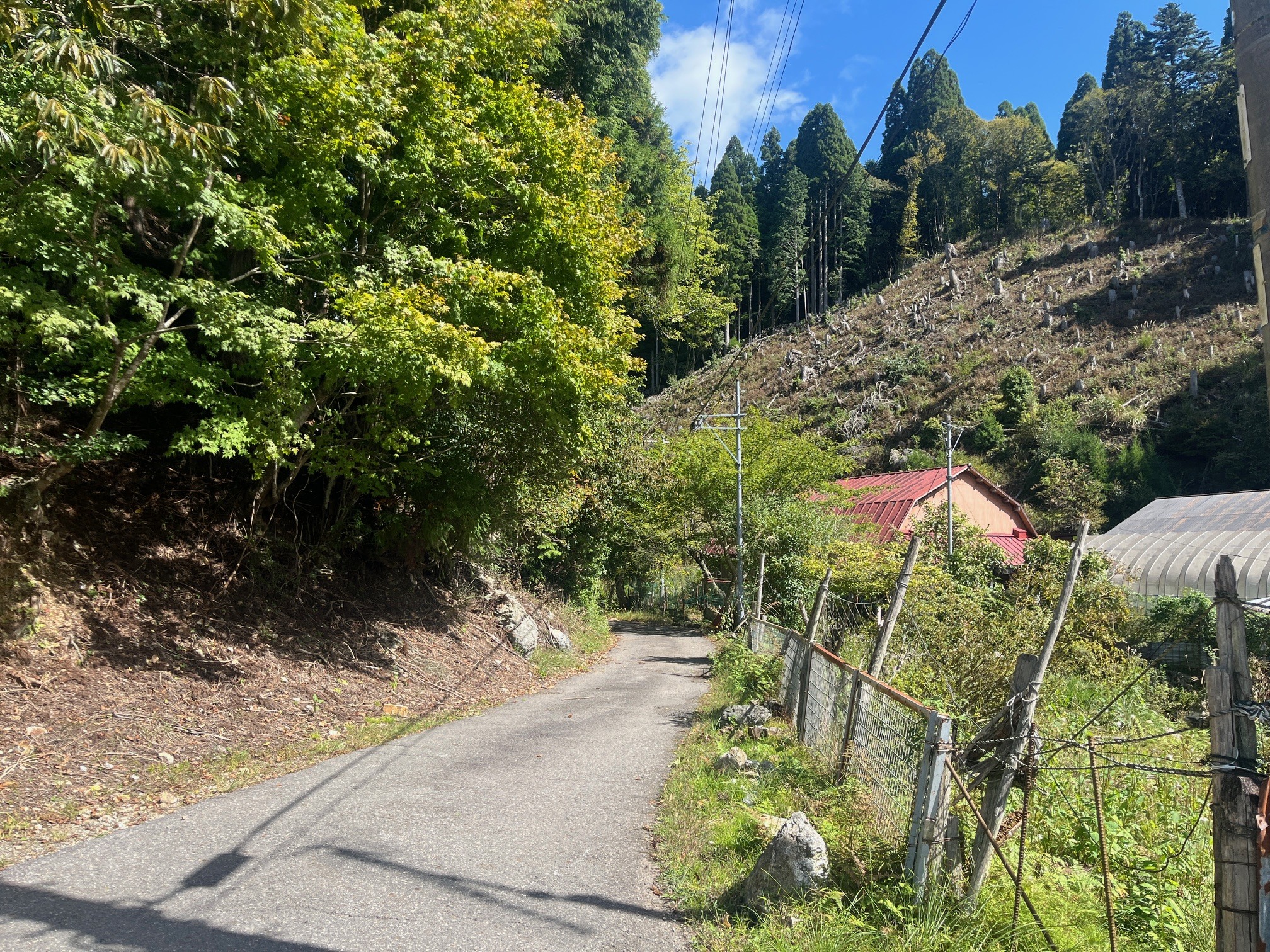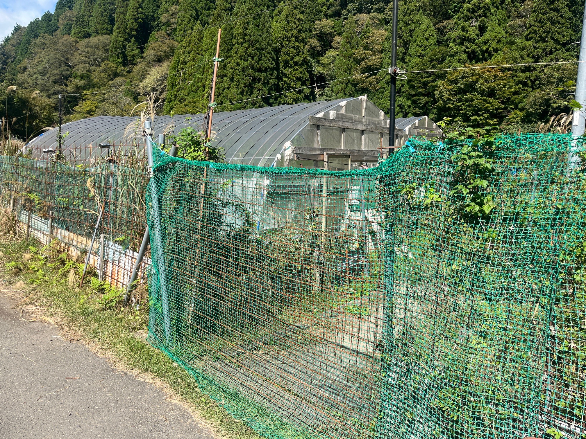 右にはビニルハウスが。もう使われてはいないのかもしれませんが、電柵やネットがきちんと張られており、今も使っていると言われてもおかしくないくらい状態はよいです。