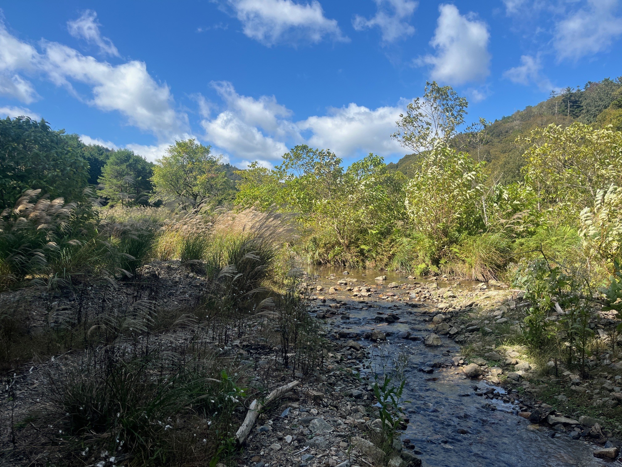 大見川の風景。このあたりは八丁平に近いせいか、湿原の雰囲気があり、広い平地になっています。美しい景色です。大見川は淀川水系の河川で、琵琶湖にそそぐ安曇川の源流です。