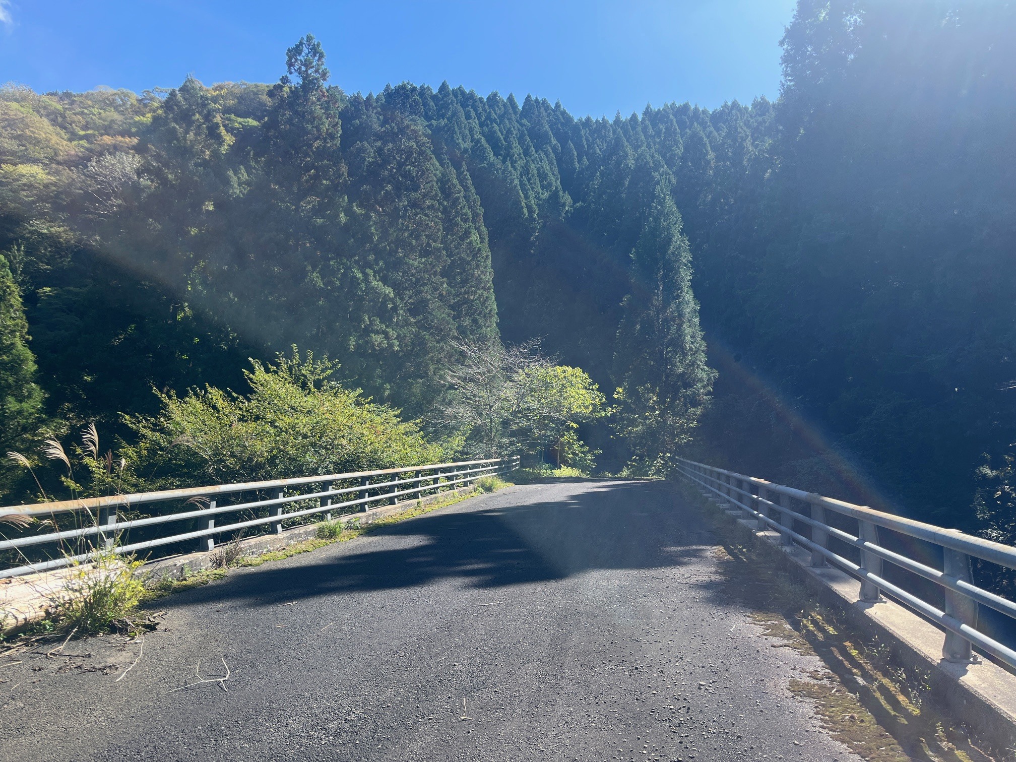 フェンスの向こうは、東に向かって、大きな橋です。銘板には「ひのこおおはし」「平成2年5月竣功」と彫られています。このあたりは大原百井町で、「ひのこ」と呼ばれる場所だそうです。花脊から大原の小出石を結ぶ「主要地方道 大原花背線」の施工済区間の一部ですが、現時点では事業休止となっており、この橋の向こうで道路は途切れています。