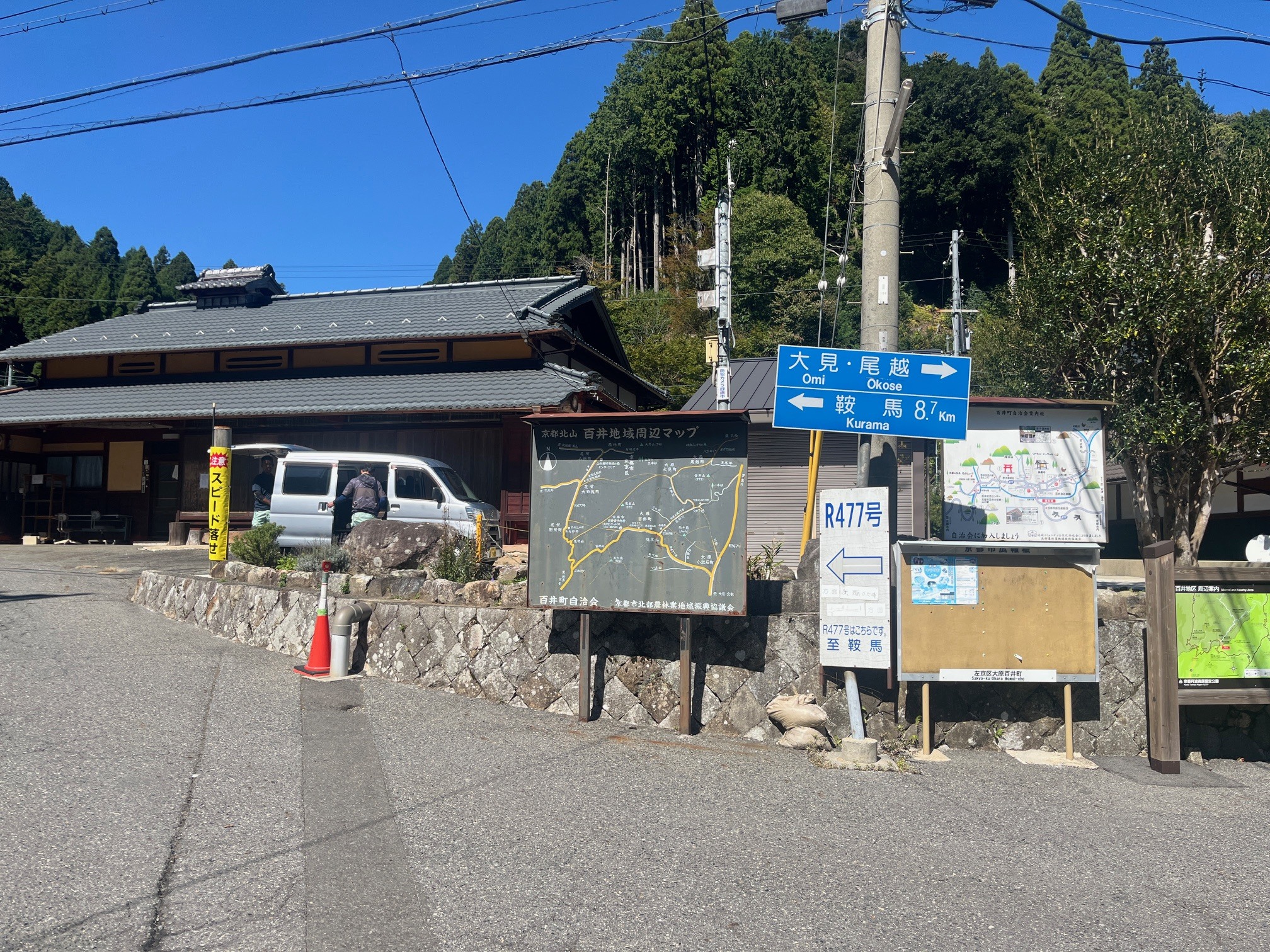 急カーブと杉木立を抜けて、尾越の集落へ。百井の三叉路から8kmちょっと。鞍馬まで行くのとどっこいどっこいの距離ですね。
