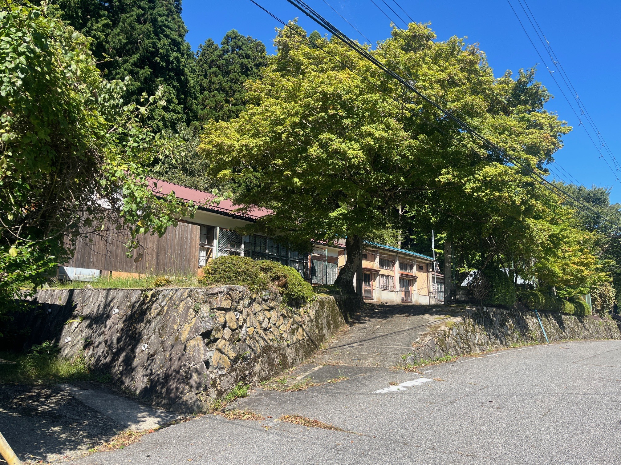 地域の夏祭り「ももいなつまつり」の会場になる元大原小学校百井分校の前を通り過ぎます。