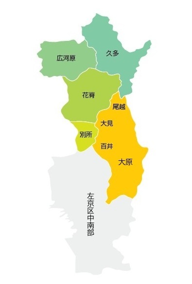 正しくは、大原大見町と大原尾越町であり、大原の中心地から北西の山間部に位置します。北部山間地域の百井(大原百井(ももい)町)の北、花脊(はなせ)の東、久多(くた)の南といえば、なんとなくイメージできますでしょうか。
