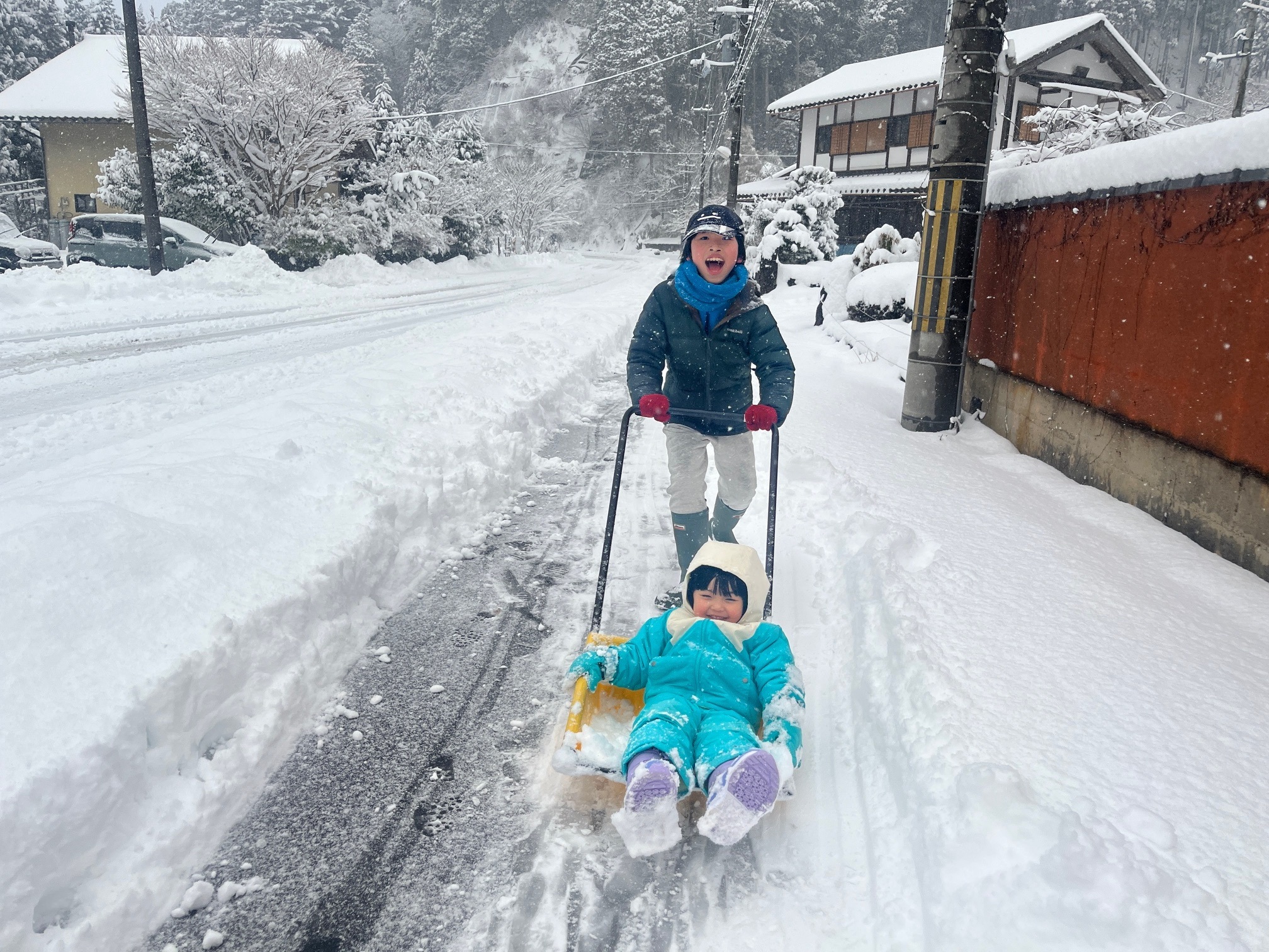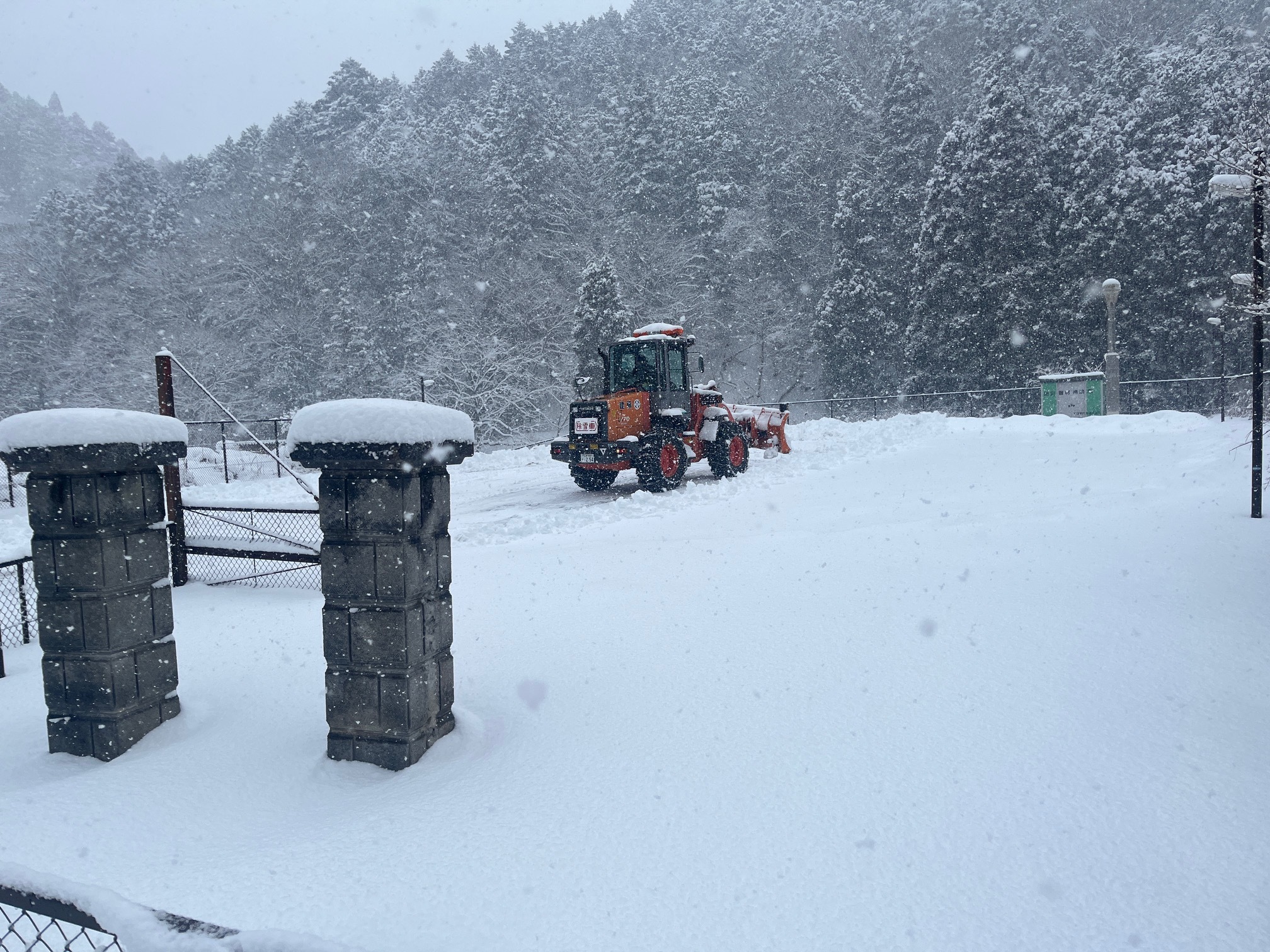 冬の強い味方、除雪車。道路だけでなく、出勤する先生が困らないように、花背小中学校の駐車場の除雪をしてくれています。