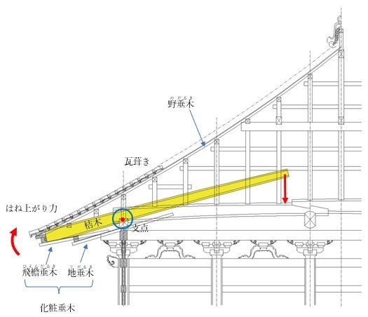 【桔木構造。内部で支える桔木に思いを馳せます。】