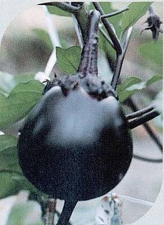 晩生種で幹,枝,葉とも大型で濃紫の葉にとげがあり,果は正円形で直径12から15㎝になります。皮は軟らかく,肉質はよく締まり光沢があり,“がく”(へた)は三角形になるとされています。