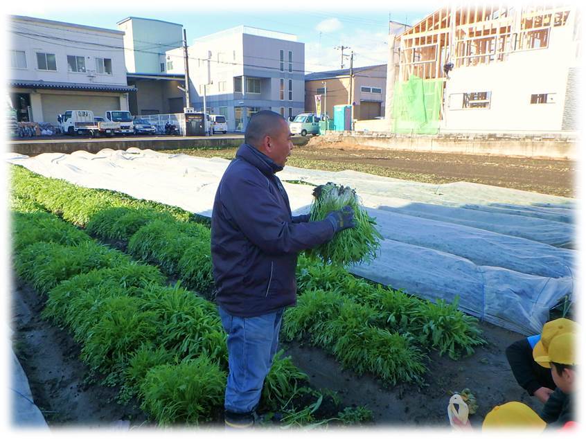 2月6日(月曜日)に上鳥羽小学校の4年生が同支部支部長の中沢氏の圃場でみず菜・壬生菜の収穫を行いました。児童らはこれまで,播種から間引き,日々の観察を行いましたが,しっかり間引けていたため,みず菜・壬生菜は立派に成長していました。