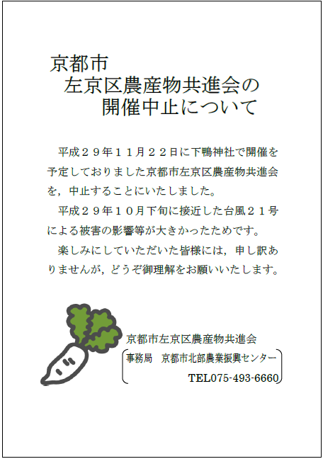 「平成29年度京都市左京区農産物共進会」開催中止のお知らせ