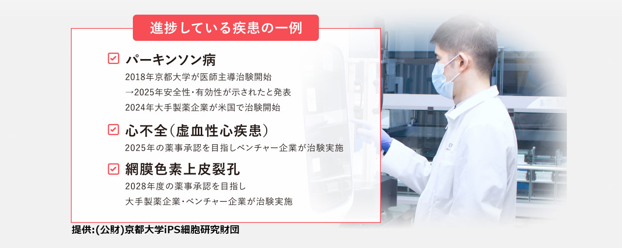 iPS財団がiPS細胞ストック(※)や技術をスムーズに提供していくことで、再生医療の裾野は広がり始め、技術の実用化に向けて着実に前進を続けています。