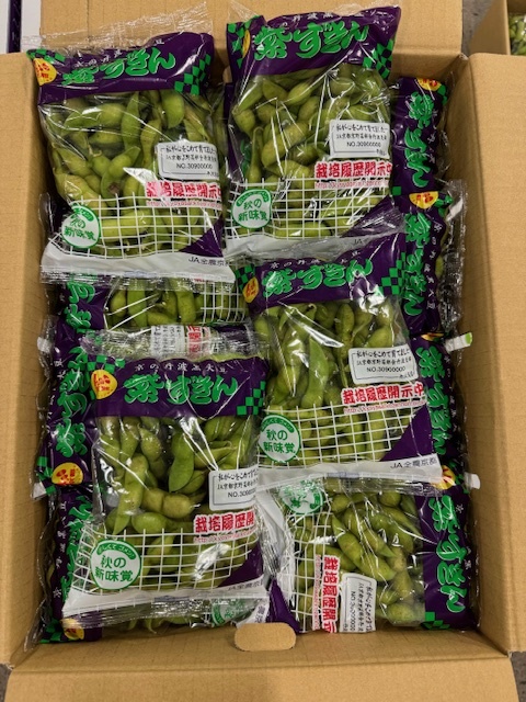 丹波黒大豆を枝豆用に改良した紫ずきんは、豆の薄皮がうっすらと紫色で頭巾のような形であることから名付けられました。大粒でモチモチした食感とコクのある甘みが魅力です。