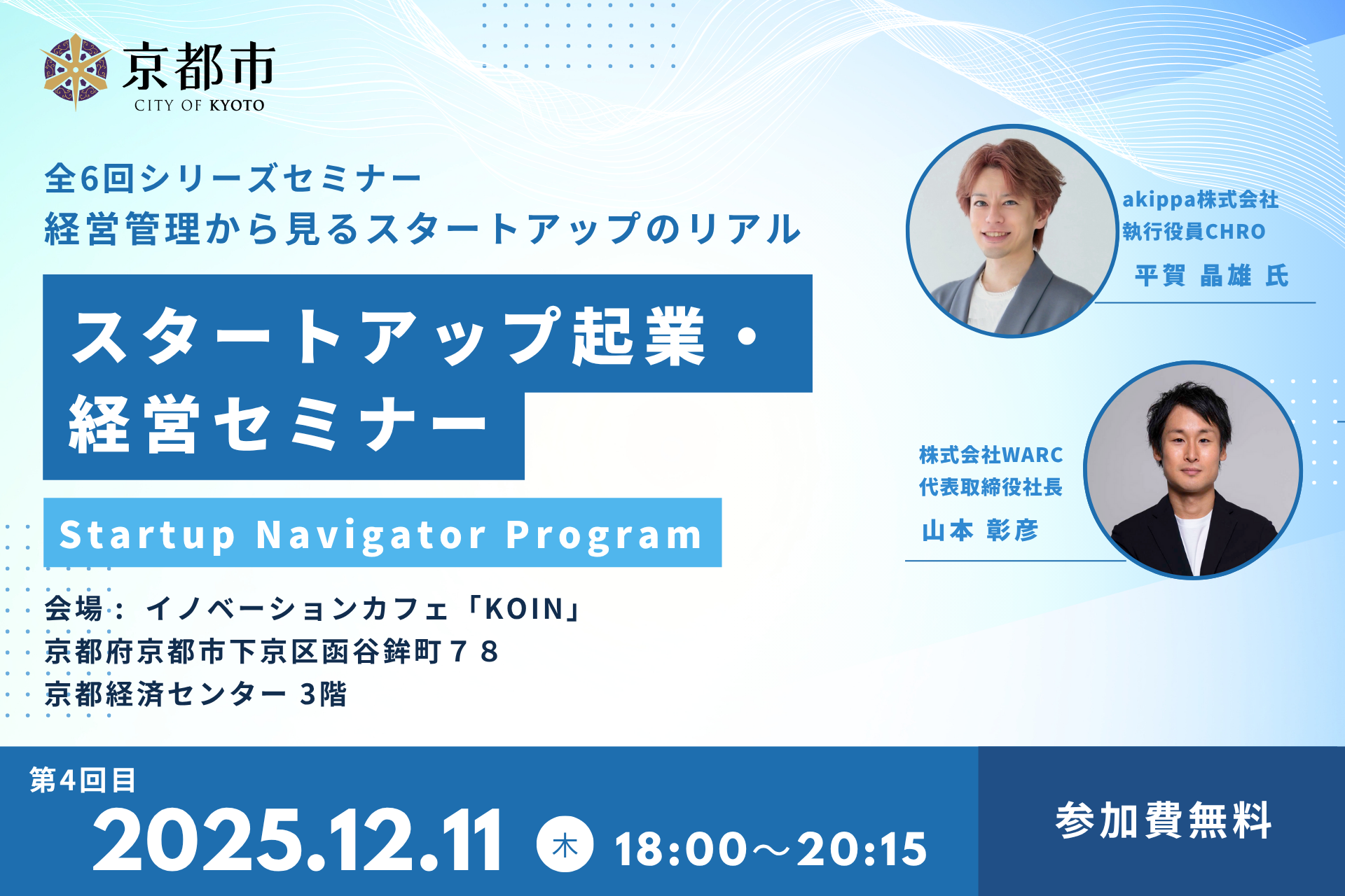 京都のスタートアップに参画する経営管理人材の発掘・育成に向け、大学生や経営管理に関心の高い若手社会人等を対象に、「経営管理から見るスタートアップのリアル」をテーマに、スタートアップの魅力やキャリアイメージ、資本戦略や人事・労務戦略といったスタートアップや企業経営に欠かせない経営管理の知識等を体系的に学ぶ連続講座を開催します。