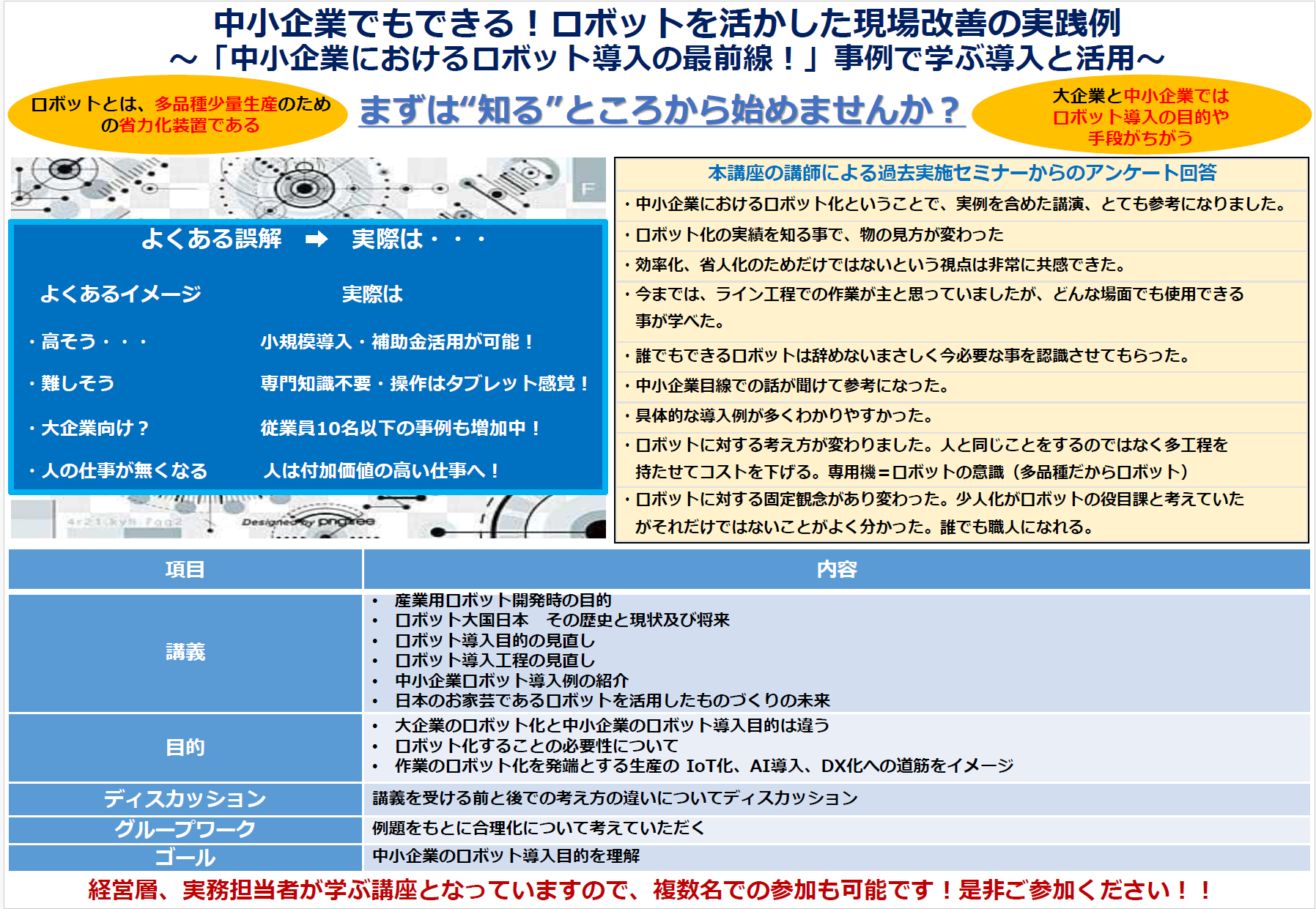 | ・セミナー 1.AIの基礎と中小企業への影響 2.AIの業務適用と成功事例 3.AI導入のステップと 社内推進体制 ・ワークショップ 1.自社業務の棚卸しとAI活用の 可能性を考える 2.AI導入アクションプラン作成 | ・セミナー 1.DXとIoT技術/デジタル化 2.業務の自動化 3.業務棚卸表の作り方& 費用対効果算出方法 ・ワークショップ 1.業務棚卸表作成演習 2.費用対効果シミュレー ション演習 | ・セミナー 1.ロボット大国日本 その歴史と現状及び将来 2.ロボット導入目的・ 導入工程の見直し 3.中小企業ロボット導入例の紹介 ・ワークショップ 生産性向上を目的とした例題に ついてグループディスカッション |