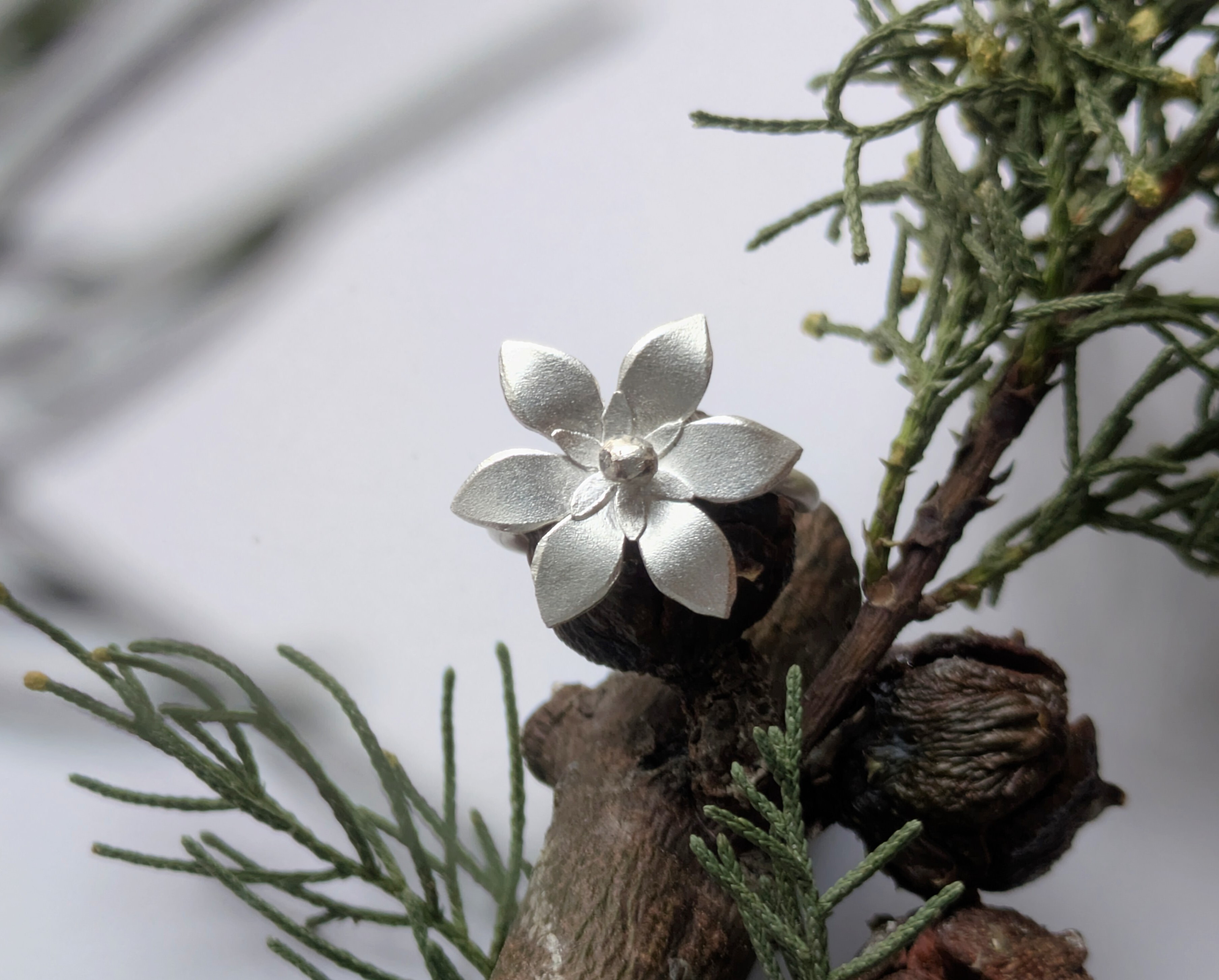金属工芸の伝統技法をベースに、銀・銅合金・錫などを用いて 植物モチーフのアイテムを制作しています。バラや桜、イチョウなど、四季を彩るアクセサリーを中心に、オブジェやテーブ ルウェアなども御用意しています。