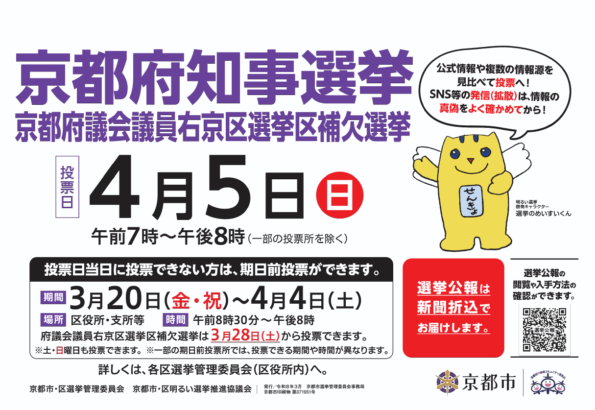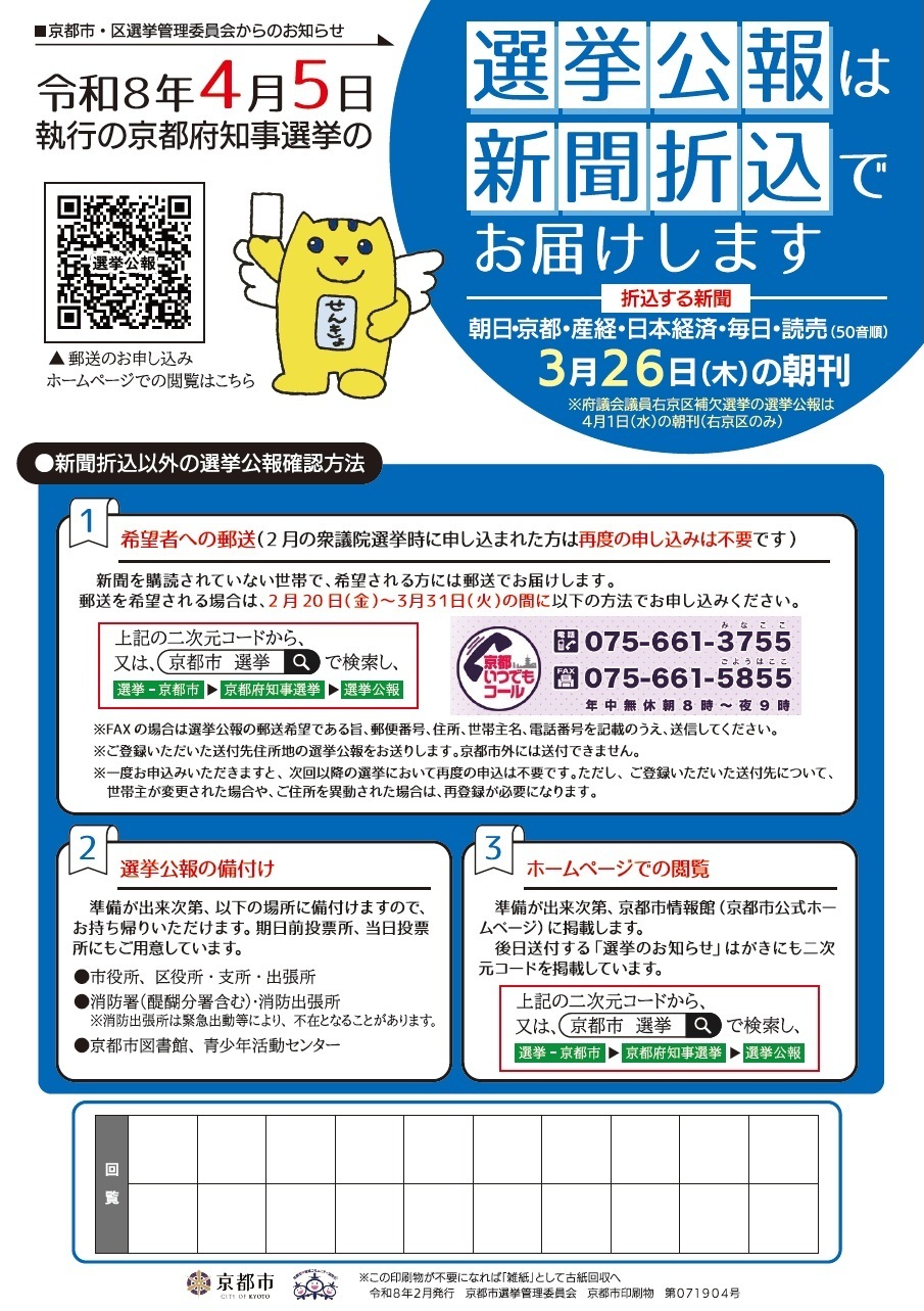 ※府議会議員右京区補欠選挙の選挙公報は4月1日(水曜日)の朝刊(右京区のみ)