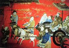 聖徳太子を祀る山です。他の山と違い真木に杉を用いており、そこに厨子に入った如意輪観音像を懸けています。前掛は緋羅紗地に中国泰代の阿房宮の刺繍を施したものです。見送は中国清代の婦人官服を使用して作られたものです。特に、地の部分がすべて金糸で刺繍されている豪華なインド刺繍の胴掛と巧緻な細工の欄縁金具や角房掛金具は必見の名品です。