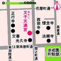 菅原道真の死後まもなく道真の邸宅(白梅殿)跡に創祀されたと伝えられ、道真生誕の地ともいわれています。仏光寺通を隔てた北側には、道真の父・是善を祀ってきた北菅大臣神社(紅梅殿神社)があります。