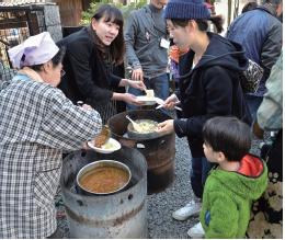 下京区には,「本塩竈町(もとしおがまちょう)」 という町名や 「塩竈山上徳寺(えんそうざんじょうとくじ)」 というお寺があることなどから,これまでから下京区は同市との交流を深めてきました。東日本大震災が発生した年の平成23年11月の 「下京区ふれ愛ひろば」 では,「絆」 をテーマに塩竈市のブースを設置するとともに,佐藤昭(さとうあきら)塩竈市長のご臨席のもと,門川大作市長と渡邊洞曉(わたなべとうぎょう)下京区ふれあい事業実行委員会委員長(当時)が復興への願いを込め 「絆」 という字を揮毫(きごう)し,塩竈市に対しエールを送りました。