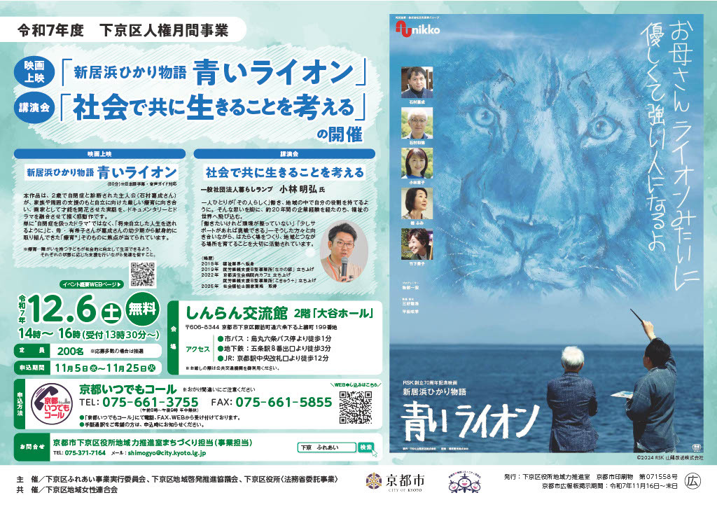 令和7年度下京区人権月間事業 映画「新居浜ひかり物語 青いライオン」の上映及び 講演会「社会で共に生きることを考える」の開催