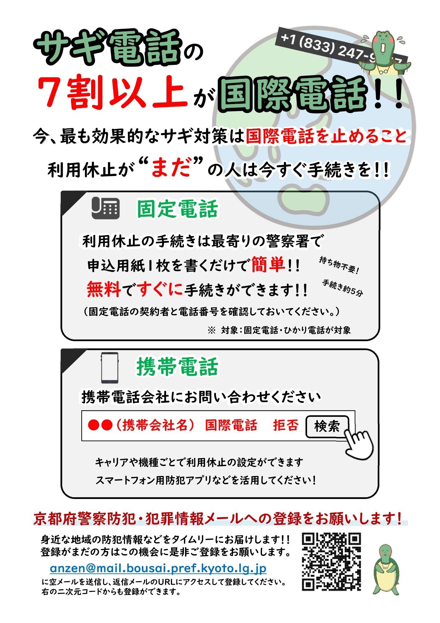 京都府警察では『固定電話』の国際電話利用休止手続きを受け付けています。