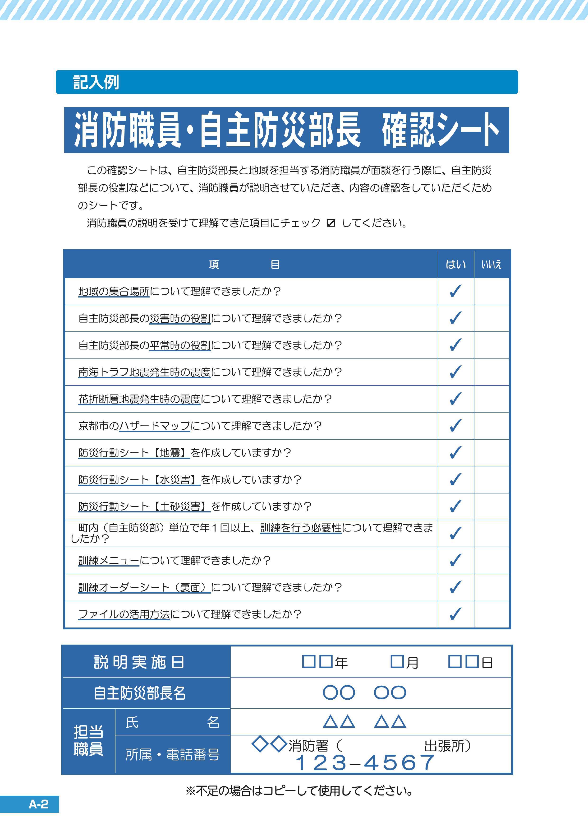 年度始めの自主防災会総会などの機会に、自主防災部長から新自主防災部長へこの自主防災部活動ファイルの引継ぎを行います。その際に地域の防災指導を担当する消防職員が面談を行い、自主防災部長の役割や訓練の必要性、訓練メニューなどを説明しますので、「消防職員・自主防災部長 確認シート」で説明内容の確認を行います。