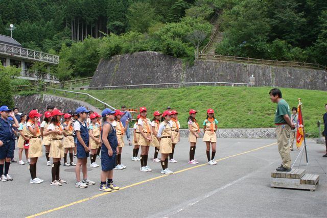 今回の研修は,クラブ員のみんなが待ちに待った「花背山の家」での宿泊研修(夏のキャンプ)です。近くにある親水広場での放水訓練に始まり,山の家への入村式,そして当日いきなり発表されたクループでの初仕事としてクループ名を決めたり,グループの旗を作ったり・・・