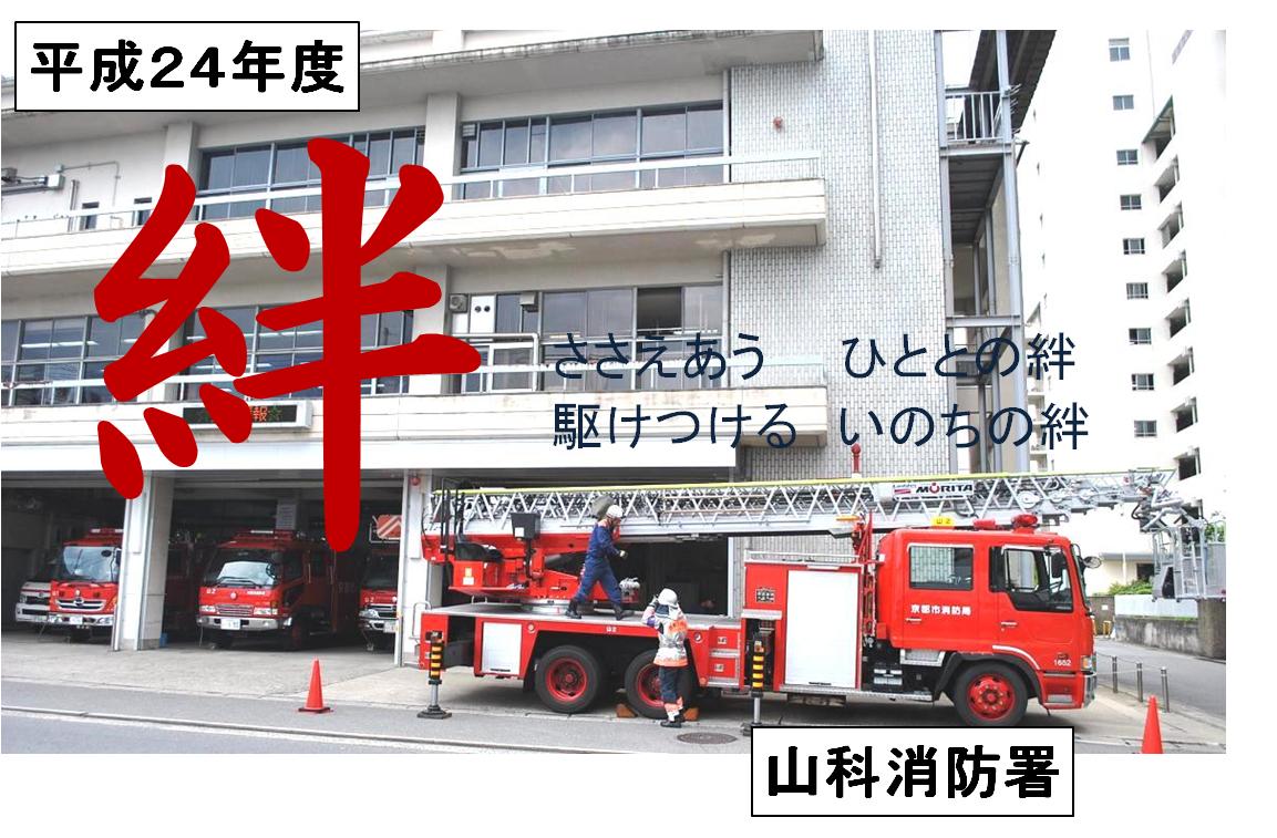 山科消防署では今年度,「ささえあう ひととの絆」「駆けつける いのちの絆」,この二つの強い絆を合言葉に,災害に備え,事故を防ぎ,安心して暮らせる山科区を目指してゆきます。
