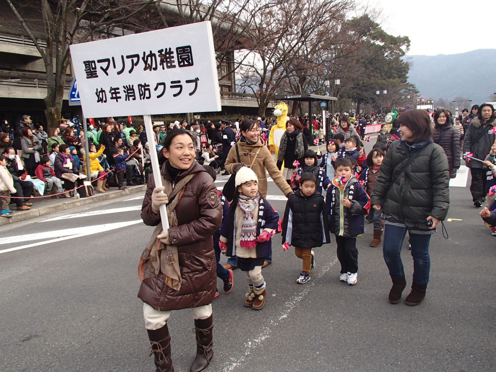 更に,今年も「左京幼年消防クラブ」の中から,学校法人京都聖マリア学園 聖マリア幼稚園(園長~菅原さと子氏)の年長組のみなさんに参加していただき,市民パレードにおいて可愛らしいはっぴ姿(火の用心)を披露していただきました。
