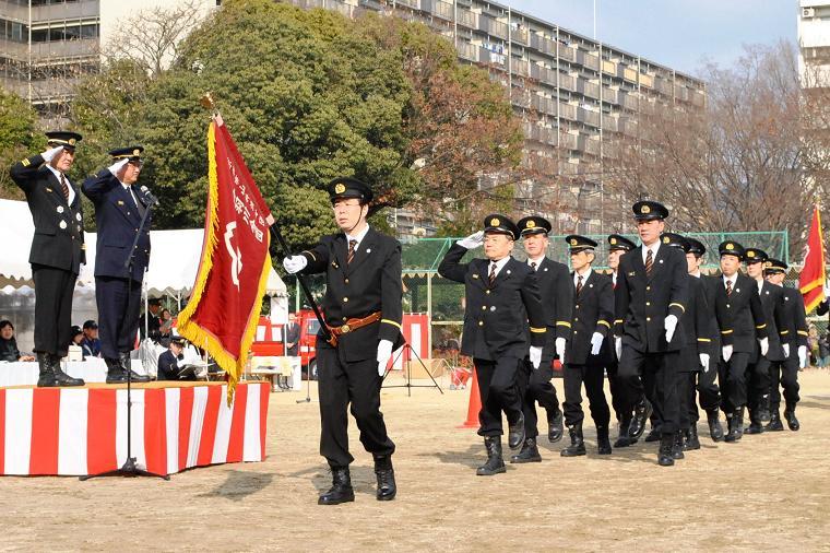 集合旗部隊を先頭にして,ラッパ隊,山科消防団の全13分団が分列行進を行い,川中山科消防団長及び宿久消防署長の観閲を受けました。