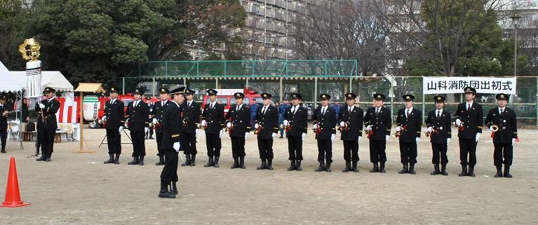 山科消防団(団長 川中長治)では,1月20日 日曜日に山科中央公園グラウンドにおいて平成25年山科消防団出初式を挙行しました。今年の出初式は,昨年,有志により結成した「山科消防団ラッパ隊」が,新調した「まとい」を先頭に整列し,森田副団長の開始報告に合わせて重厚な音色を響かせるなど,例年とは違った雰囲気の中で式典を終え,団員一同が山科区の無火災を目指して思いを新たにしました。
