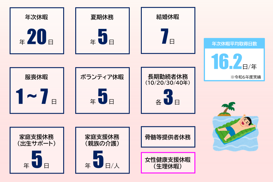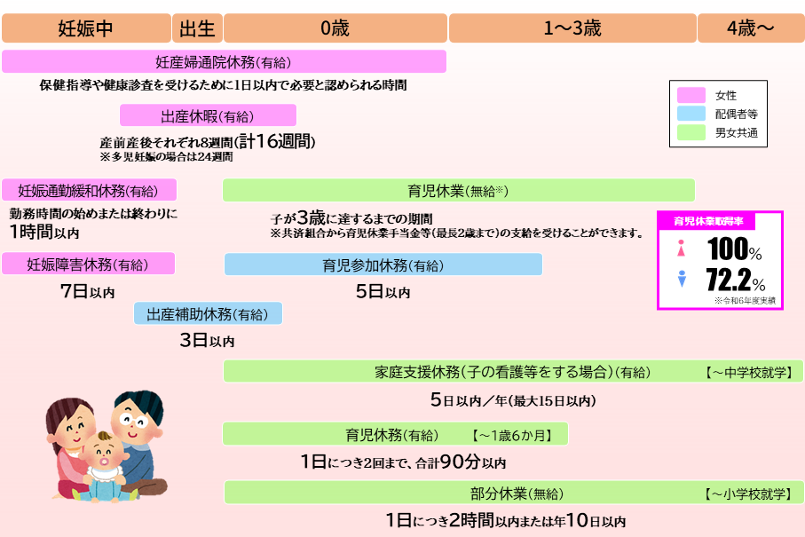 休暇等の取得だけでなく、早出遅出勤務(始業及び終業時間を30分または1時間繰り上げ又は繰り下げ)することもできます(交替制勤務除く)。