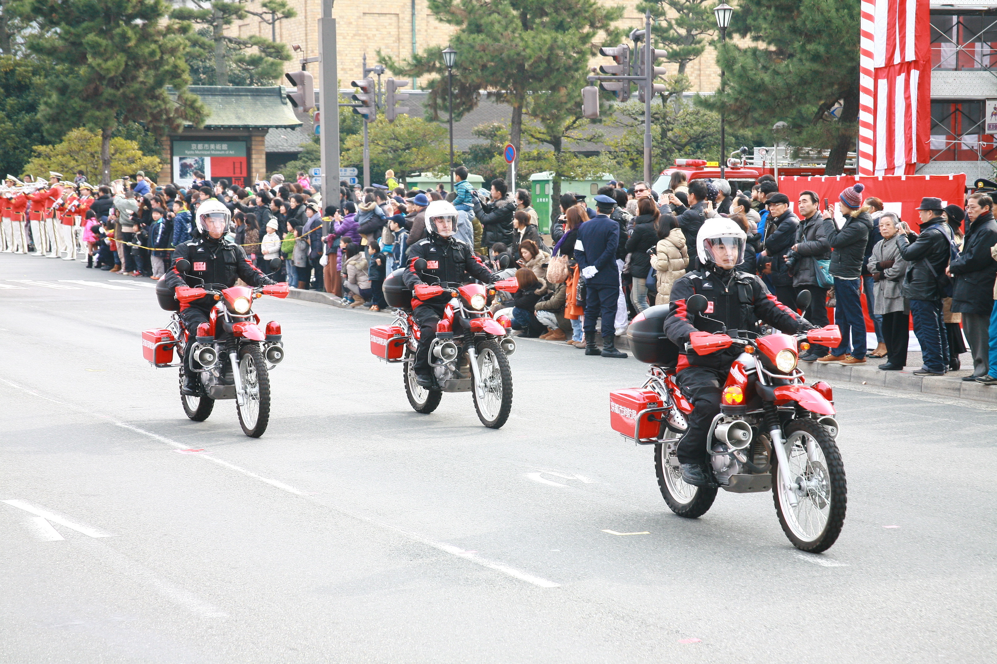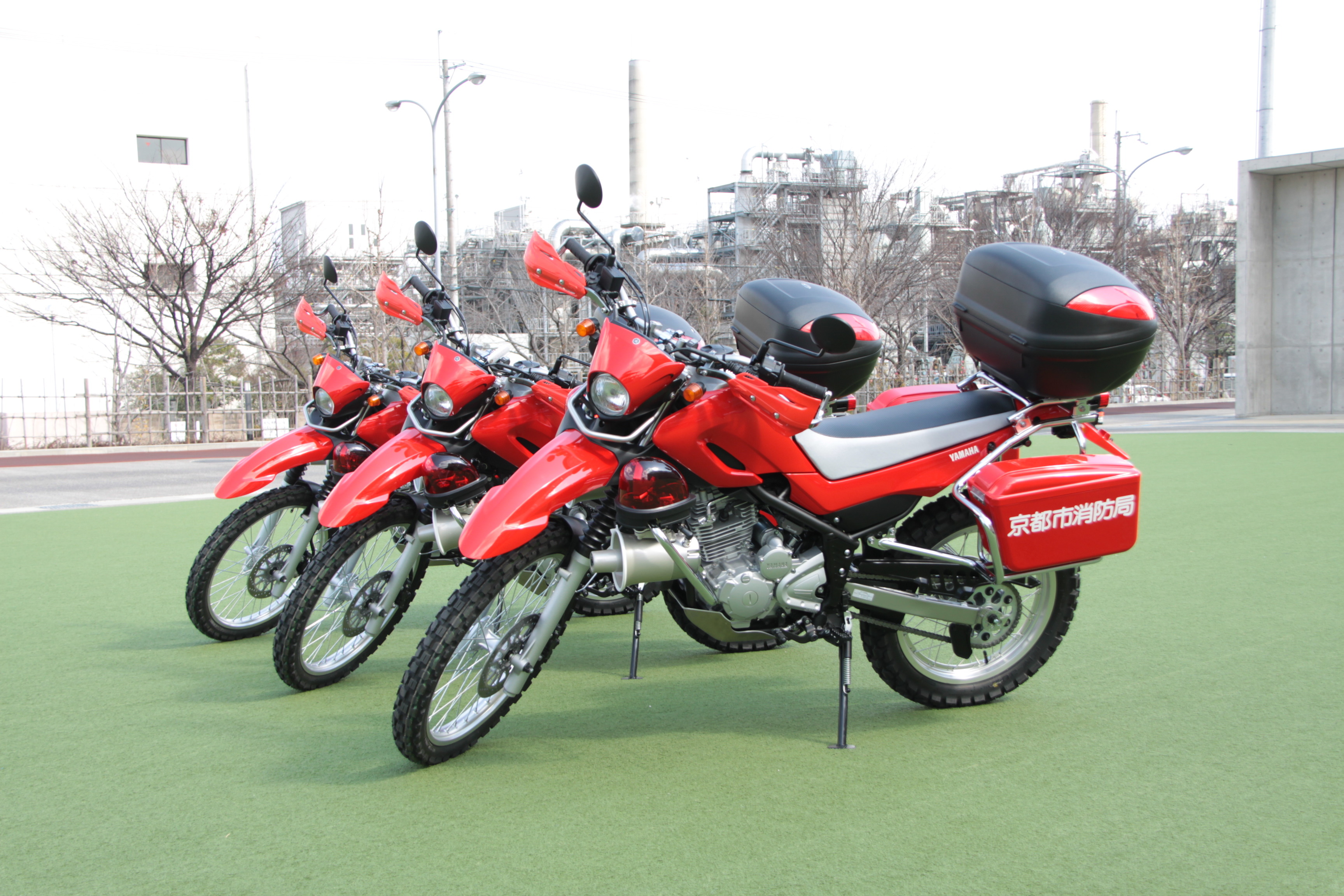 ヤマハSEROW250ccのオフロードバイクを緊急車仕様にしたもので,消火器や小破壊器具などの消防器材,人工呼吸用マスクや三角巾などの救急器材を積載しています。